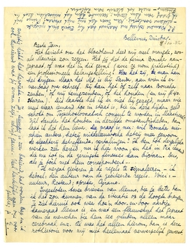 We komen eindelijk een beetje uit de rommel, maar er is dan ook op gezwoegd! Ik heb 2 dikke handen door een vreemde zwelling van mijn huid, tengevolge van het vele wasschen met terpentijn. Maar onze verfprestaties, zoowel van Bep als van mij, naderen dan ook angstig dicht het heroïeke. - Ja, Dumay is zeer boeiend, dat vonden Bep en ik ook. Benieuwd wat jij ervan zegt; schrijf gauw. Veel hartelijks van ons voor jullie;