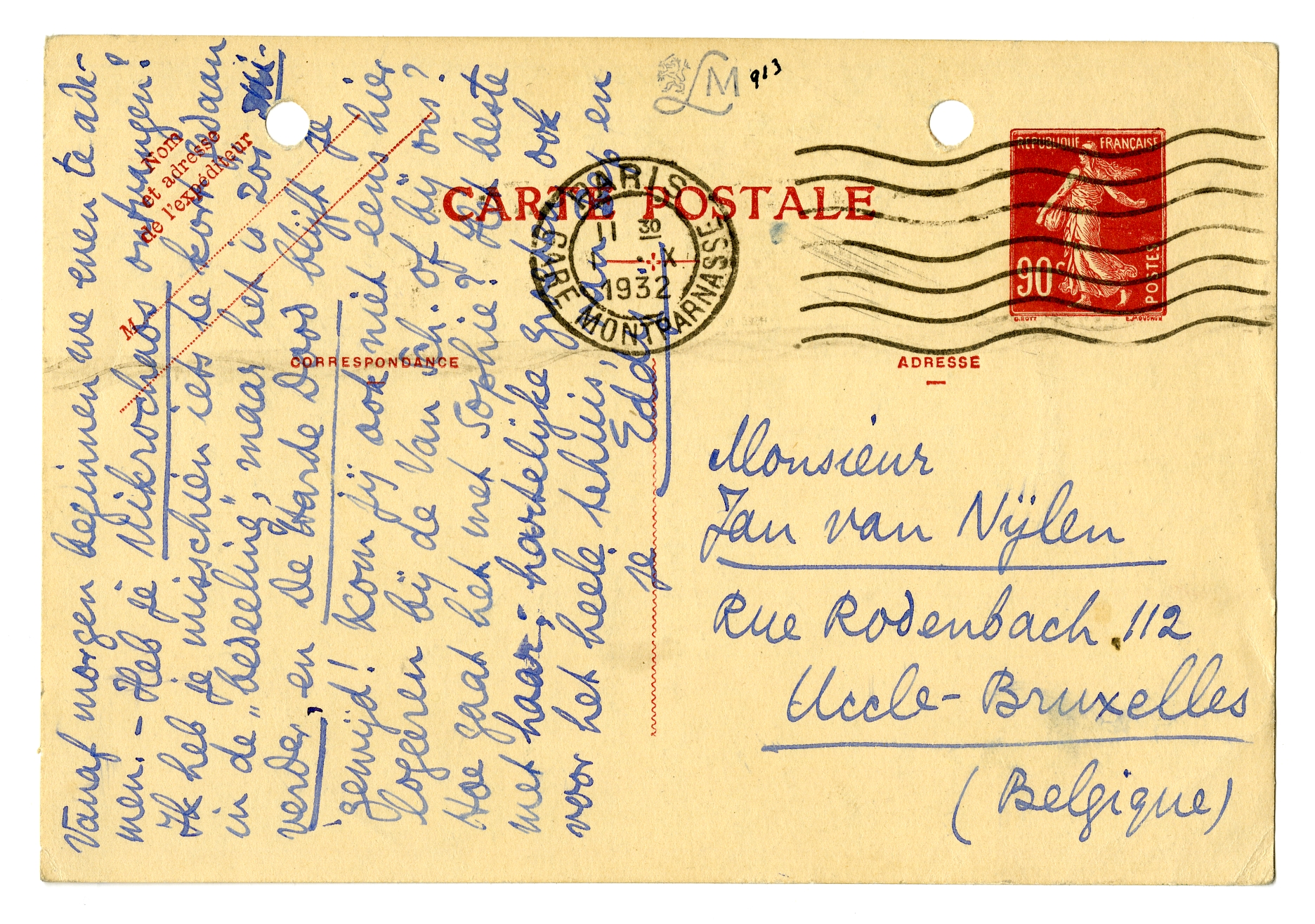 Neem me niet kwalijk, als ik niet meer bij je ben geweest. De laatste dagen in Gistoux waren zoo vol beslommeringen en ook in Brussel had ik altijd alleen maar eventjes tijd voor de ‘Passage’. Hier is het een ijselijke rommel geweest, waar we zelfs in hebben gesla-pen, en voortdurend geschipper uit geldgebrek. Het is wel de meest ‘realistische’ episode uit mijn leven geweest. Bep en ik waren soms heelemaal gedeprimeerd van al het eigen gesjouw en gereken, maar enfin, ik weet nu tenminste dat er een verver in mij steekt. Daartusschendoor allerlei gedonder over mijn Uren met Coster, waarover Jan je wel vertellen zal. Schrijf ons hierheen. Vanaf morgen beginnen we even te ademen. - Heb je Mikrochaos ontvangen? Ik heb je misschien iets te kort gedaan in de ‘bedeeling’,2341 maar het is zóó zuiverder, en De Harde Dood blijft je gewijd! Kom jij ook niet eens hier logeeren bij de Van Sch. of bij ons? Hoe gaat het met Sophie? Het beste met haar; hartelijke groeten ook voor het heele tehuis, van Bep en