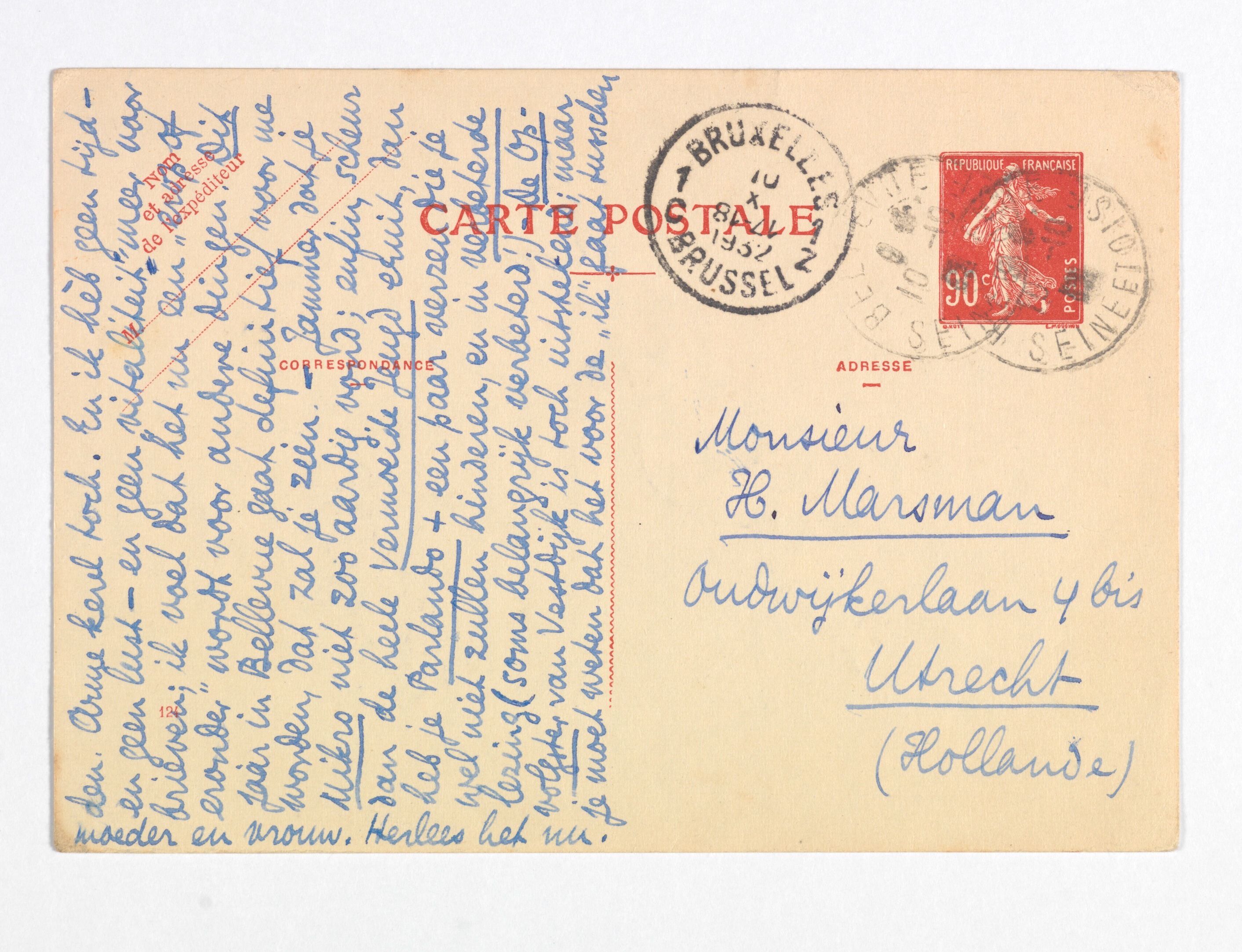 B.H. - Veel dank voor je brief. Ik ben vandaag erg ontmoedigd, als ik denk aan die artikelenschrijverij; ik heb geprobeerd iets anders te doen, maar voel me door dit idee gekweld en afgeleid. Kunnen we er niet iets op vinden dat mij geld opbrengt en jou ook, en waardoor we meteen iets presteeren? Kan je in Holland geen moeite doen (bv. bij Meulenhoff) voor dat idee van die essays?2352 Ik vertaal ze dan en jij geeft de ‘bekentenis’-voorrede. Maar alleen als ervoor betaald wordt; je zou dat in de eerste plaats moeten vragen. Als je ervoor voelt, span je er dan direct voor - schrijf mij gauw het resultaat, dan probeer ik hier de essays los te krijgen. - Zijlstra verdomt het om Uren met Coster als boek uit te geven; wel stelt hij het zetsel gratis tot mijn beschikking! Een heerlijk geval; Menno is nu bezig een z.g. N.V. op te richten om de boekuitgave tòch door te zetten, wat verdomd aardig van hem is. Als je misschien andere dingetjes voor me weet of bedenken kunt, graag. - Van Slau kreeg ik een briefkaart vóór zijn vertrek, en een pak enveloppen om te vullen en na te zenden. Arme kerel toch. En ik hèb geen tijd - en geen lust - en geen ‘vitaliteit’ meer voor brieven; ik voel dat het nu een ‘erop of eronder’ wordt voor andere dingen. Dit jaar in Bellevue gaat definitief voor me worden, dat zal je zien. - Jammer dat je Mikro niet zoo aardig vond; enfin, scheur dan de heele Vermoeide Jeugd eruit, dan heb je Parlando + een paar verzen die je wel niet zullen hinderen, en in verbeterde lezing (soms belangrijk verbeterd!) - De Opvolgster2353 van Vestdijk is toch uitstekend; maar je moet weten dat het voor de ‘ik’ gaat tusschen moeder en vrouw. Herlees het nu. Dank voor je aanbod. Géén proeven, neen! Hart. gr. voor de twee;