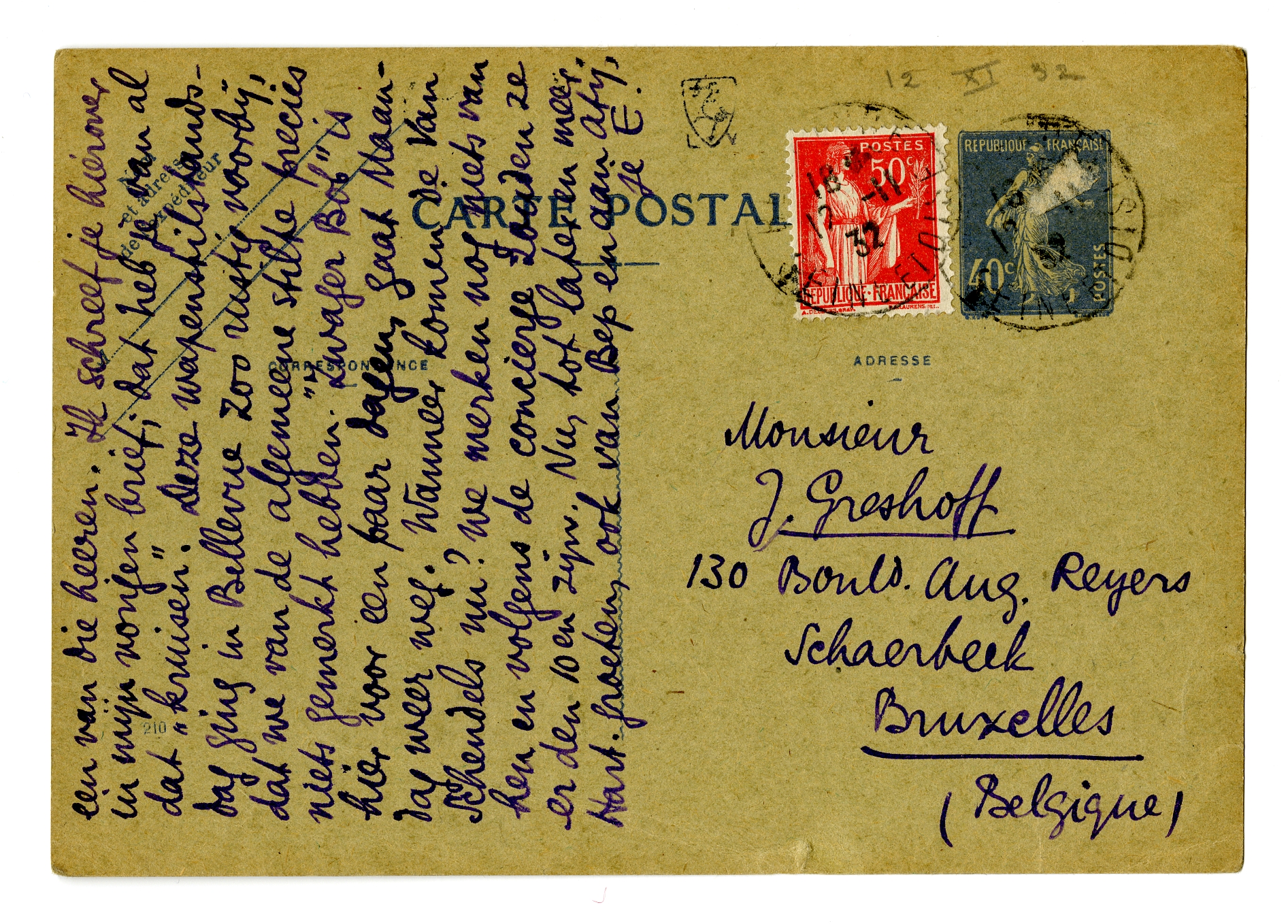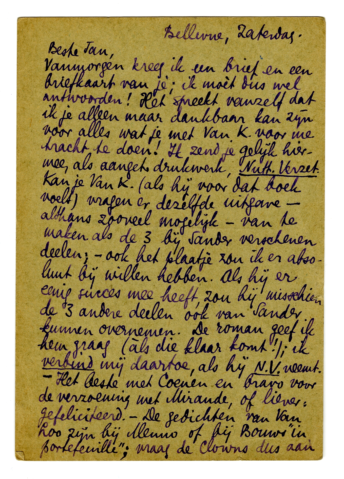 Vanmorgen kreeg ik een brief en een briefkaart van je; ik moèt dus wel antwoorden! Het spreekt vanzelf dat ik je alleen maar dankbaar kan zijn voor alles wat je met Van K. voor me tracht te doen! Ik zend je gelijk hiermee, als aanget. drukwerk, Nutt.Verzet. Kan je Van K. (als hij voor dat boek voelt) vragen er dezelfde uitgave - althans zooveel mogelijk - van te maken als de 3 bij Sander verschenen deelen2406; - ook het plaatje zou ik er absoluut bij willen hebben. Als hij er eenig succes mee heeft, zou hij misschien de 3 andere deelen ook van Sander kunnen overnemen. De roman geef ik hem graag (àls die klaar komt!); ik verbind mij daartoe, als hij N.V. neemt. - Het beste met Coenen en bravo voor de verzoening met Mirande,2407 of liever: gefeliciteerd. - De gedichten van Van Loo zijn bij Menno of bij Bouws ‘in portefeuille’; vraag de Clowns dus aan een van die heeren. Ik schreef je hierover in mijn vorigen brief; dat heb je van al dat ‘kruisen’. Deze wapenstilstandsdag ging in Bellevue zoo rustig voorbij, dat we van de algemeene stilte precies niets gemerkt hebben. ‘Zwager Bob’ is hier voor een paar dagen, gaat Maandag weer weg. Wanneer komen de Van Schendels nu? We merken nog niets van hen en volgens de concierge zouden ze er den 10en zijn. Nu, tot later en meer. Hart. groeten, ook van Bep en aan Aty,