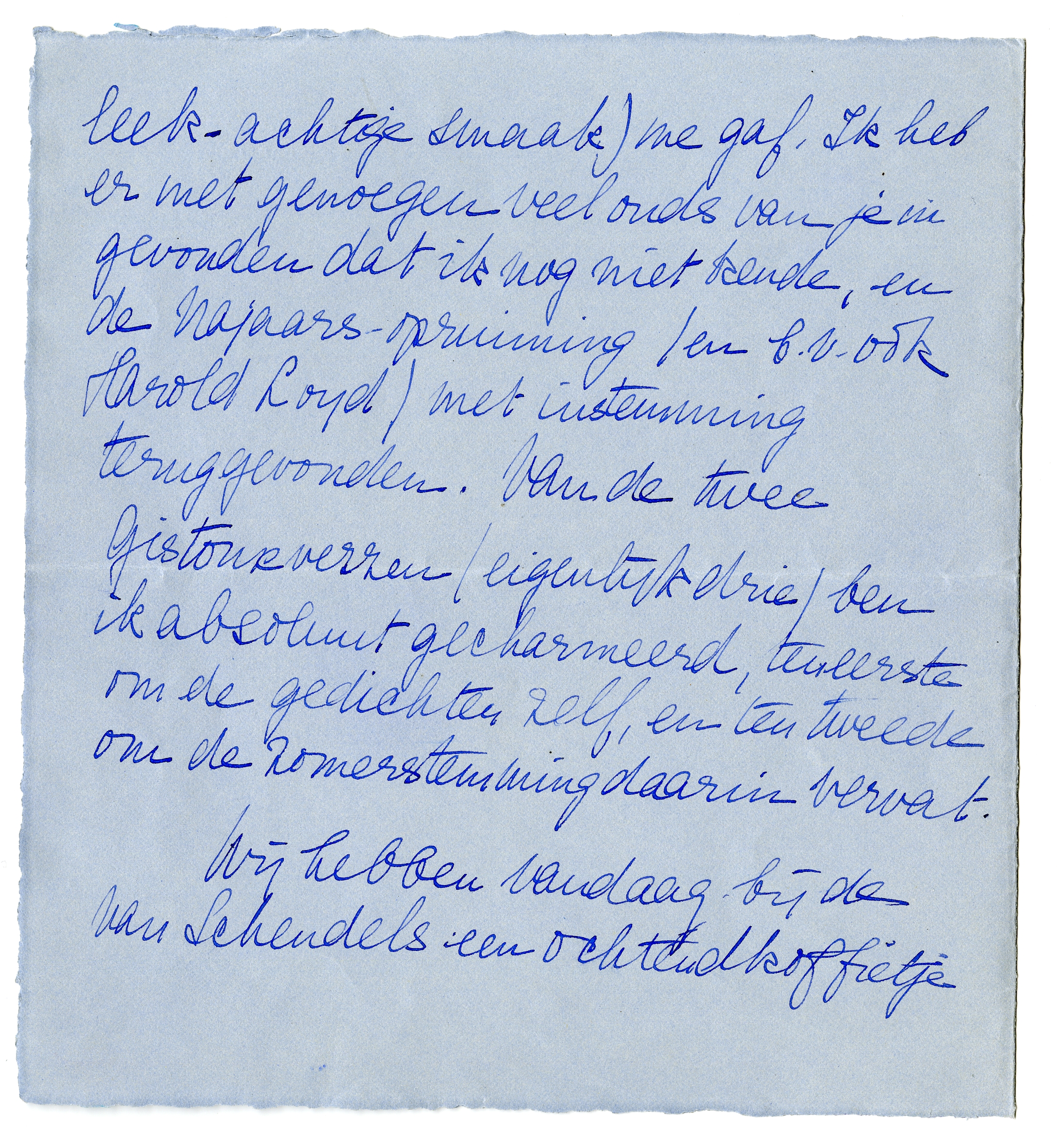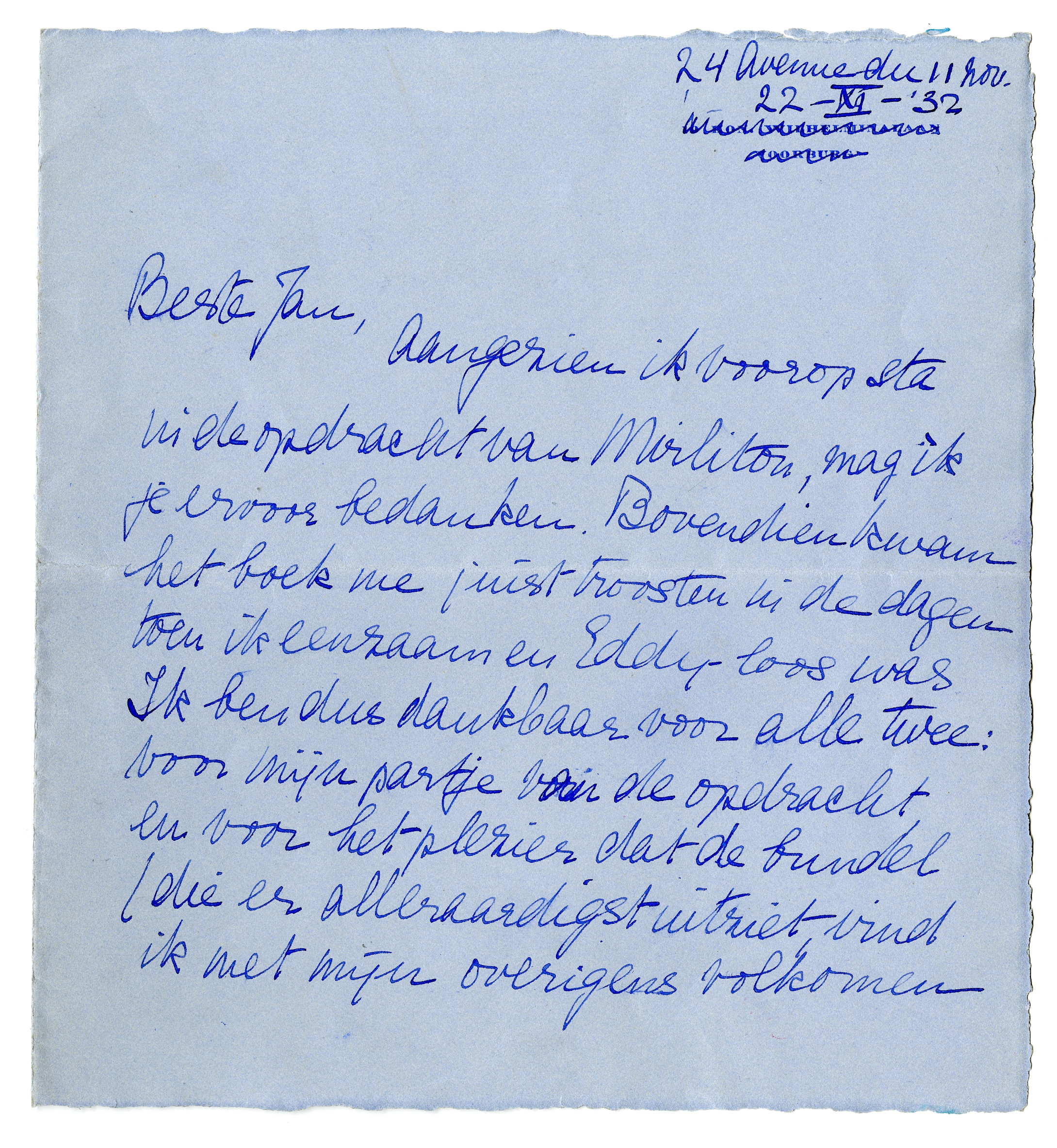 Aangezien ik voorop sta in de opdracht van Mirliton, mag ìk je ervoor bedanken. Bovendien kwam het boek me juist troosten in de dagen toen ik eenzaam en Eddy-loos was. Ik ben dus dankbaar voor alle twee: voor mijn partje van de opdracht en voor het plezier dat de bundel (die er alleraardigst uitziet, vind ik met mijn overigens volkomen leek-achtige smaak) me gaf. Ik heb er met genoegen veel ouds van je in gevonden dat ik nog niet kende, en de Najaars-opruiming (en b.v. ook Harold Loyd) met instemming teruggevonden. Van de twee Gistoux verzen (eigenlijk drie) ben ik absoluut gecharmeerd, ten eerste om de gedichten zelf, en ten tweede om de zomerstemming daarin vervat.