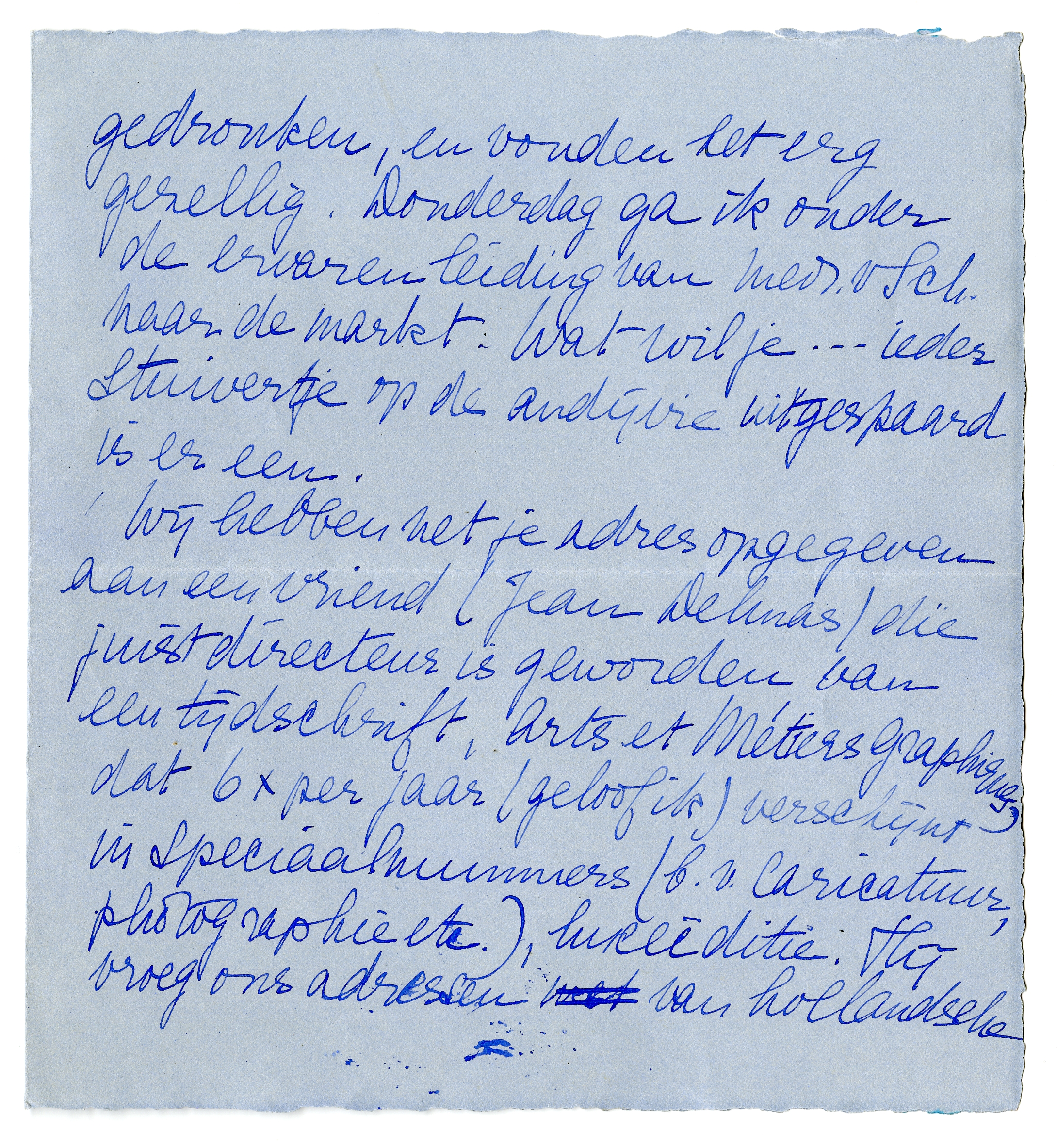 Wij hebben net je adres opgegeven aan een vriend (Jean Delmas) die juist directeur is geworden van een tijdschrift, Art et Métiers Graphiques, dat 6 × per jaar (geloof ik) verschijnt in speciaalnummers (bv. caricatuur, photographie etc.), luxeéditie. Hij vroeg ons adressen van hollandsche critici, en ik denk dat hij er je een nummer van zal willen sturen. Hij vroeg ook of er soortgelijke tijdschriften in Holland bestonden; weet jij er soms? Je bent zoo op de hoogte. Ik dacht aan Wendingen en het V.A.N.K.jaarboek.