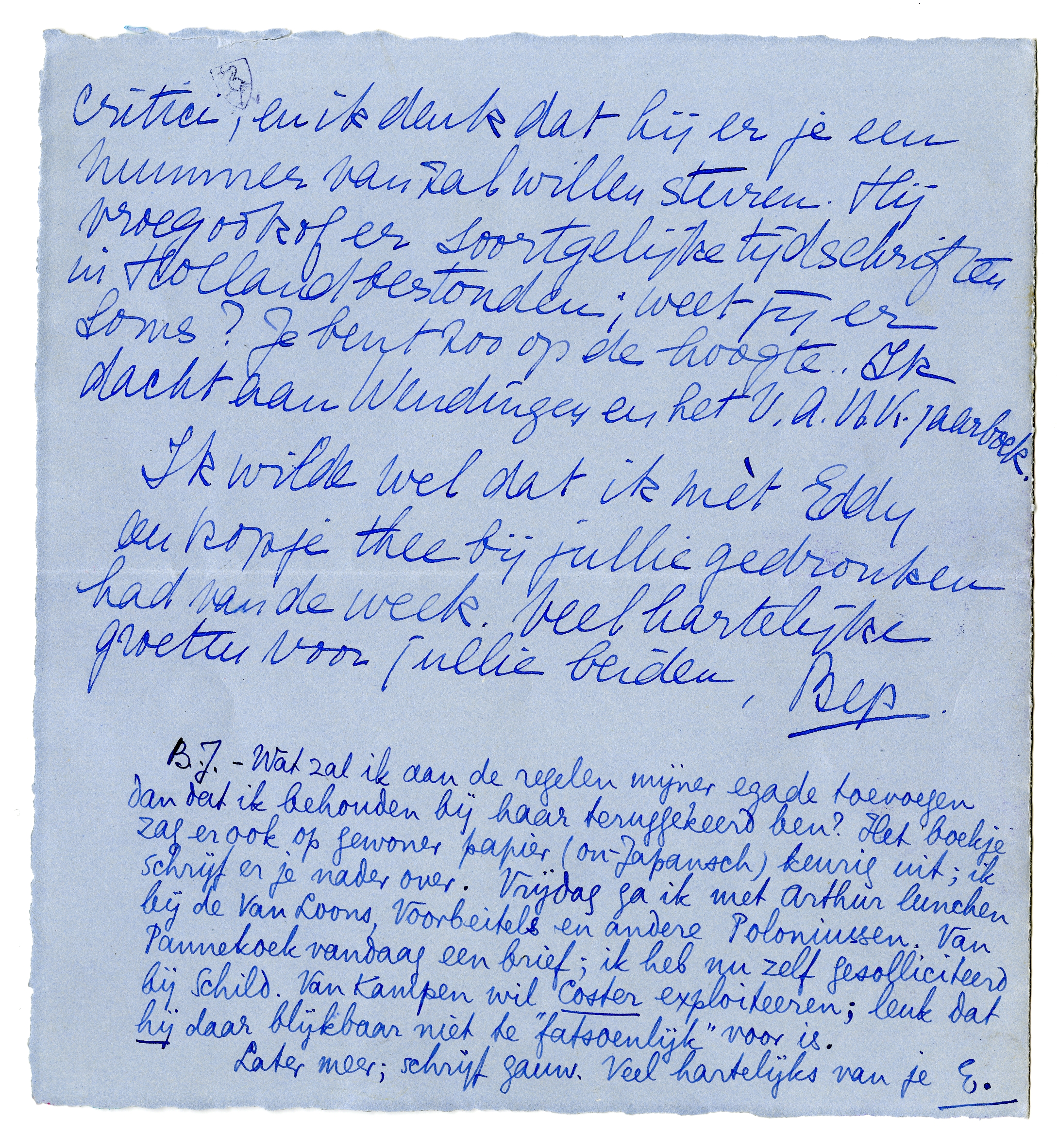 BJ. - Wat zal ik aan de regelen mijner egade toevoegen dan dat ik behouden bij haar teruggekeerd ben? Het boekje zag er ook op gewoner papier (on-Japansch) keurig uit; ik schrijf er je nader over. Vrijdag ga ik met Arthur lunchen bij de Van Loons, Voorbeitels en andere Poloniussen.2424 Van Pannekoek vandaag een brief; ik heb nu zelf gesolliciteerd bij Schild. Van Kampen wil Coster exploiteeren; leuk dat hij daar blijkbaar niet te ‘fatsoenlijk’ voor is.