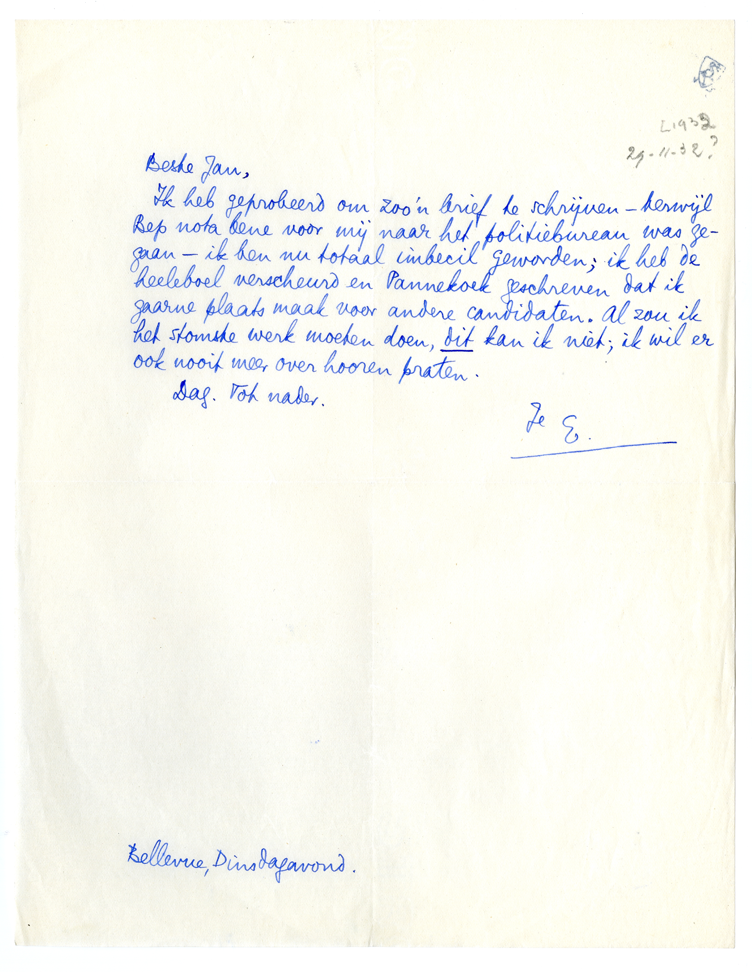 Ik heb geprobeerd om zoo'n brief te schrijven - terwijl Bep nota bene voor mij naar het politiebureau was gegaan - ik ben nu totaal imbecil geworden; ik heb de heeleboel verscheurd en Pannekoek geschreven dat ik gaarne plaats maak voor andere candidaten. Al zou ik het stomste werk moeten doen, dit kan ik niet; ik wil er ook nooit meer over hooren praten.