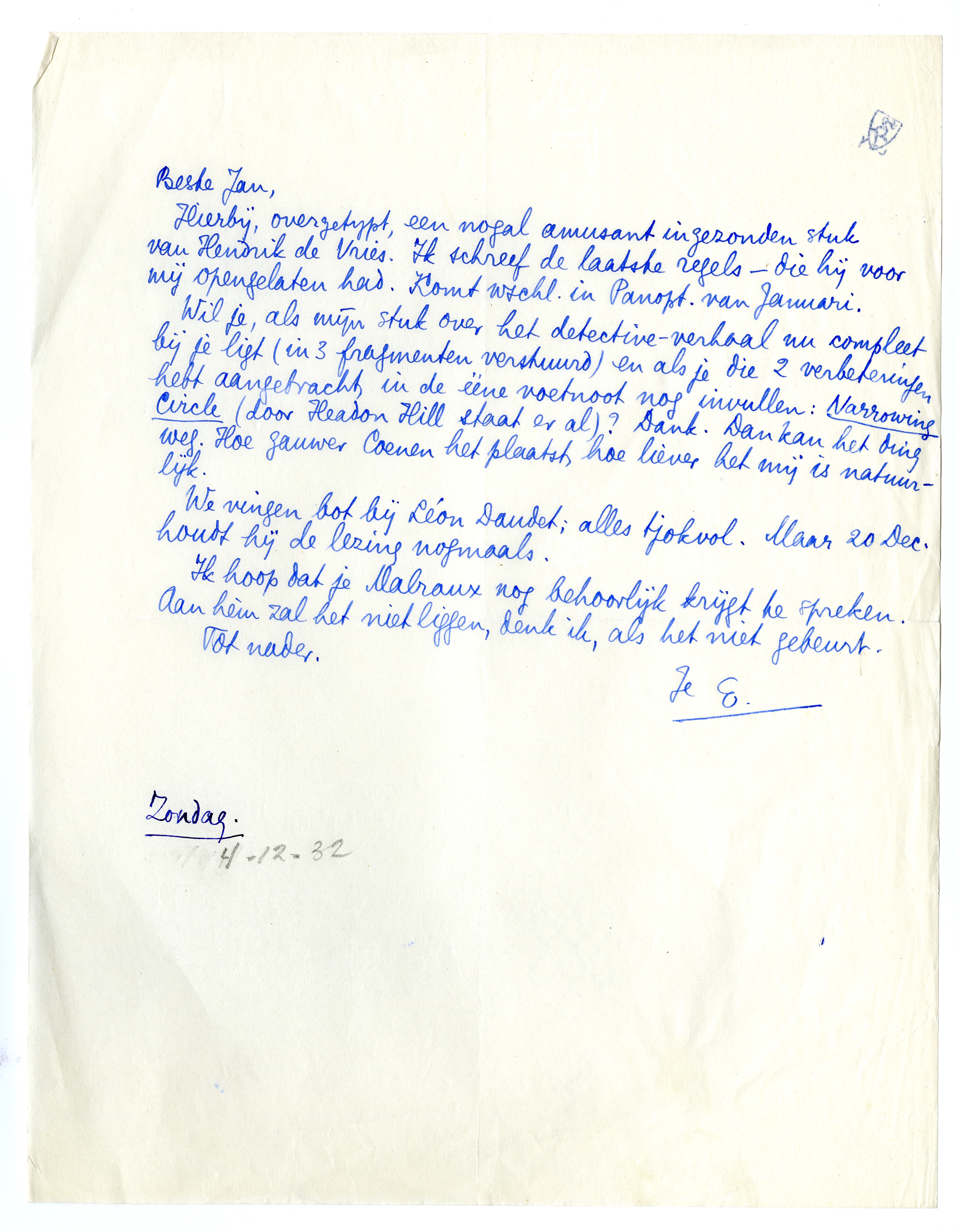 Hierbij, overgetypt, een nogal amusant ingezonden stuk van Hendrik de Vries.2450 Ik schreef de laatste regels - die hij voor mij opengelaten had. Komt wschl. in Panopt. van Januari.
