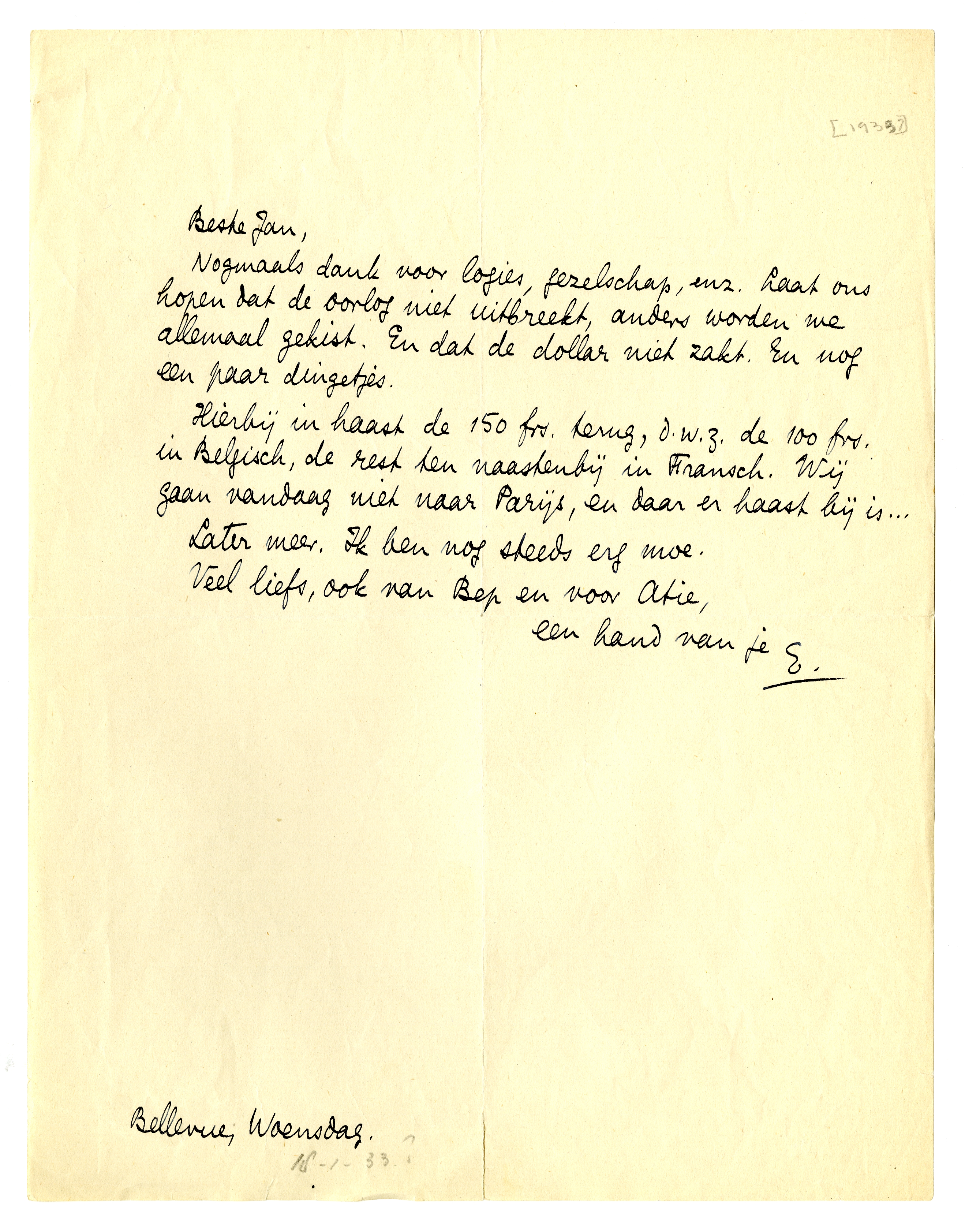 Hierbij in haast de 150 frs. terug, d.w.z. de 100 frs. in Belgisch, de rest ten naastenbij in Fransch. Wij gaan vandaag niet naar Parijs, en daar er haast bij is...