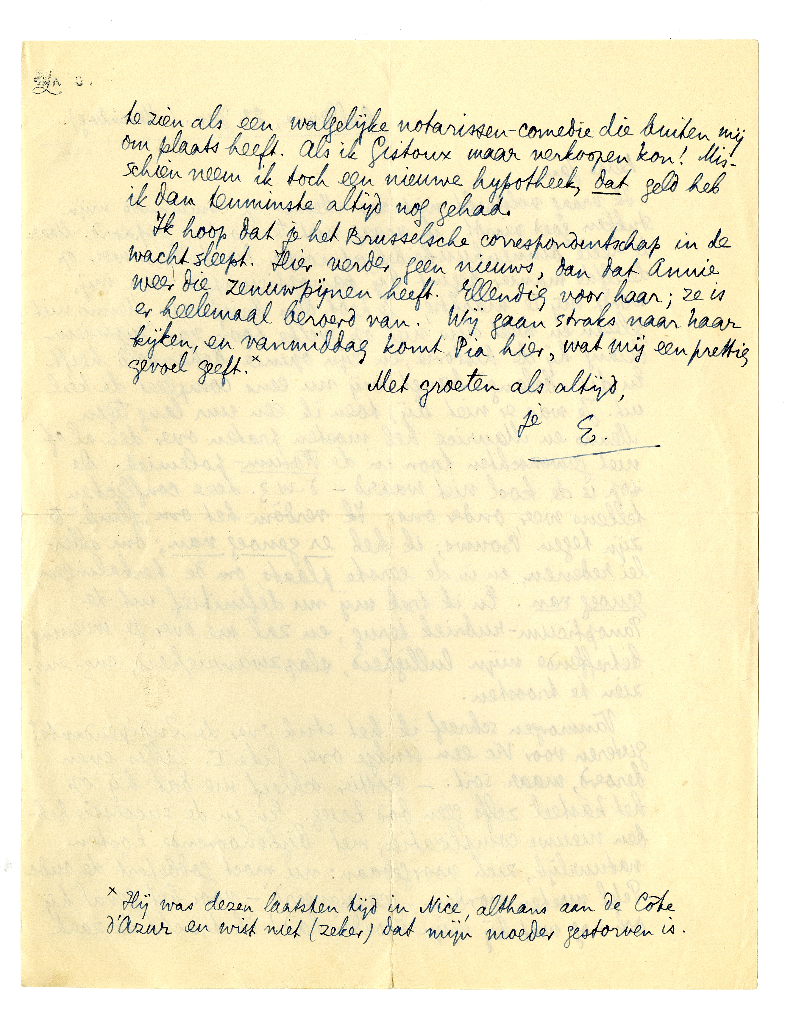 Ik hoop dat je het Brusselsche correspondentschap2518 in de wacht sleept. Hier verder geen nieuws, dan dat Annie2519 weer die zenuwpijnen heeft. Ellendig voor haar; ze is er heelemaal beroerd van. Wij gaan straks naar haar kijken, en vanmiddag komt Pia hier, wat mij een prettig gevoel geeft.*