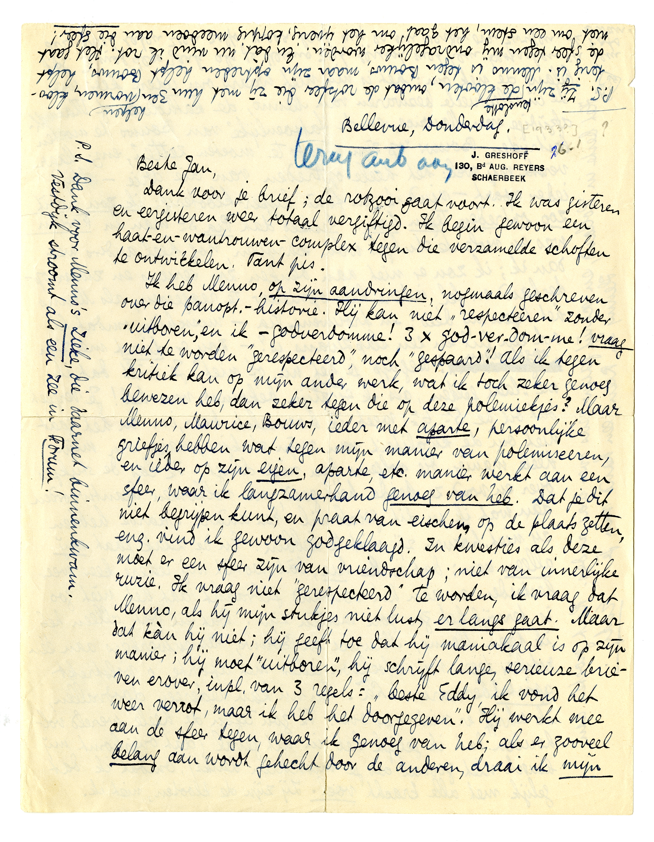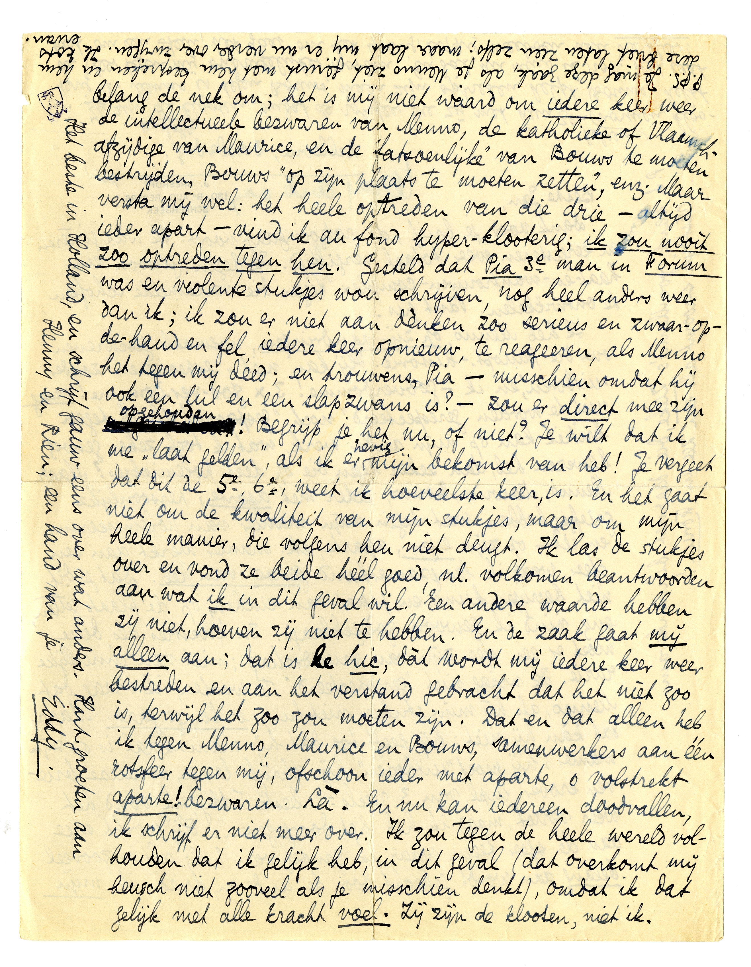 Ik heb Menno, op zijn aandringen, nogmaals geschreven over die panopt.-historie. Hij kan niet ‘respecteeren’ zonder ‘uitboren’, en ik - godverdomme! 3 × god-ver-dom-me! vraag niet te worden ‘gerespecteerd’, noch ‘gespaard’! Als ik tegen kritiek kan op mijn ander werk, wat ik toch zeker genoeg bewezen heb, dan zeker tegen die op deze polemiekjes? Maar Menno, Maurice, Bouws, ieder met aparte, persoonlijke griefjes, hebben wat tegen mijn manier van polemiseeren, en ieder op zijn eigen, aparte, etc. manier werkt aan een sfeer, waar ik langzamerhand genoeg van heb. Dat je dit niet begrijpen kunt, en praat van eischen, op de plaats zetten, enz. vind ik gewoon godgeklaagd. In kwesties als deze moet er een sfeer zijn van vriendschap; niet van innerlijke ruzie. Ik vraag niet ‘gerespecteerd’ te worden, ik vraag dat Menno, als hij mijn stukjes niet lust, er langs gaat. Maar dat kàn hij niet; hij geeft toe dat hij maniakaal is op zijn manier; hij moet ‘uitboren’, hij schrijft lange serieuze brieven erover, inpl. van 3 regels: ‘beste Eddy, ik vond het weer verrot, maar ik heb het doorgegeven’. Hij werkt mee aan de sfeer tegen, waar ik genoeg van heb; als er zooveel belang aan wordt gehecht door de anderen, draai ik mijn belang de nek om; het is mij niet waard om iedere keer weer de intellectueele bezwaren van Menno, de katholieke of Vlaamsch-afzijdige van Maurice, en de ‘fatsoenlijke’ van Bouws te moeten bestrijden, Bouws ‘op zijn plaats te moeten zetten’, enz. Maar versta mij wel: het heele optreden van die drie - altijd ieder apart - vind ik au fond hyper-klooterig; ik zou nooit zoo optreden tegen hen. Gesteld dat Pia 3e man in Forum was en violente stukjes wou schrijven, nog heel anders weer dan ik; ik zou er niet aan dènken zoo serieus en zwaar-op-de-hand en fel, iedere keer opnieuw, te reageeren, als Menno het tegen mij deed; en trouwens, Pia - misschien omdat hij ook een lul en een slapzwans is? - zou er direct mee zijn opgehouden! Begrijp je het nu, of niet? Je wilt dat ik me ‘laat gelden’, als ik er hevig mijn bekomst van heb! Je vergeet dat dit de 5e, 6e, weet ik hoeveelste keer, is. En het gaat niet om de kwaliteit van mijn stukjes, maar om mijn heele manier, die volgens hen niet deugt. Ik las de stukjes over en vond ze beide héél goed, nl. volkomen beantwoorden aan wat ik in dit geval wil. Een andere waarde hebben zij niet, hoeven zij niet te hebben. En de zaak gaat mij alleen aan; dat is le hic, dàt wordt mij iedere keer weer bestreden en aan het verstand gebracht dat het niet zoo is, terwijl het zoo zou moeten zijn. Dat en dat alleen heb ik tegen Menno, Maurice en Bouws, samenwerkers aan één rotsfeer tegen mij, ofschoon ieder met aparte, o volstrekt aparte! bezwaren. Là. En nu kan iedereen doodvallen, ik schrijf er niet meer over. Ik zou tegen de heele wereld volhouden dat ik gelijk heb, in dit geval (dat overkomt mij heusch niet zooveel als je misschien denkt), omdat ik dat gelijk met alle kracht voel. Zij zijn de klooten, niet ik.