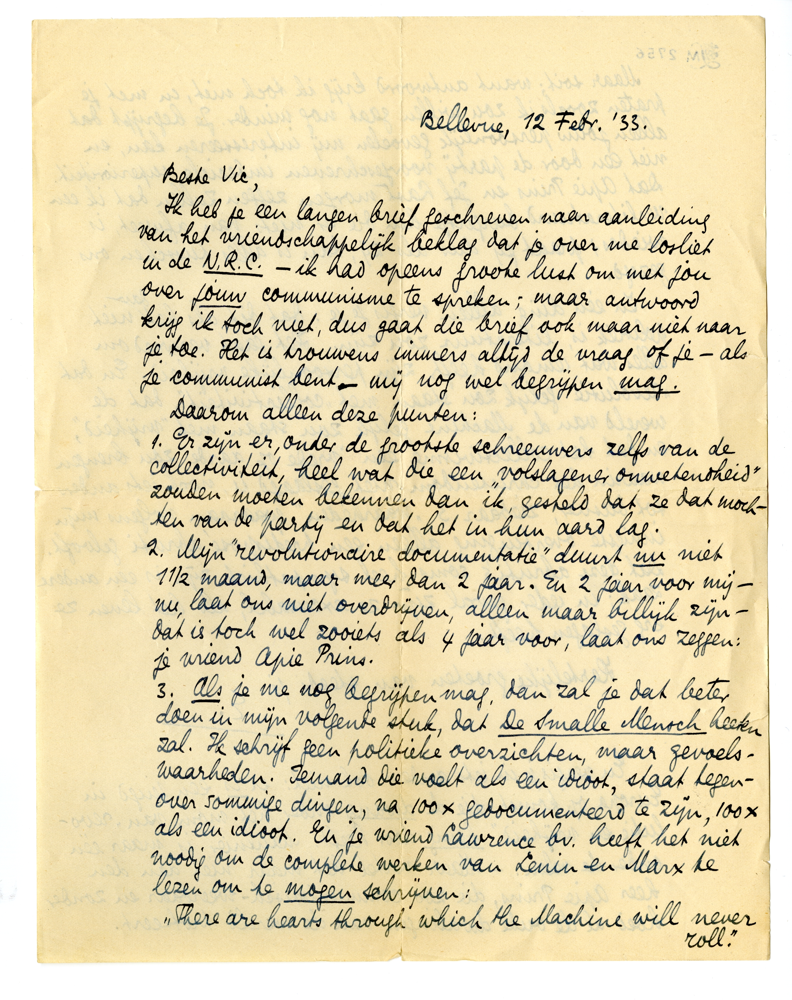 Ik heb je een langen brief geschreven naar aanleiding van het vriendschappelijk beklag dat je over me losliet in de N.R.C.2539 - ik had opeens groote lust om met jou over jouw communisme te spreken; maar antwoord krijg ik toch niet, dus gaat die brief ook maar niet naar je toe. Het is trouwens immers altijd de vraag of je - als je communist bent - mij nog wel begrijpen mag.