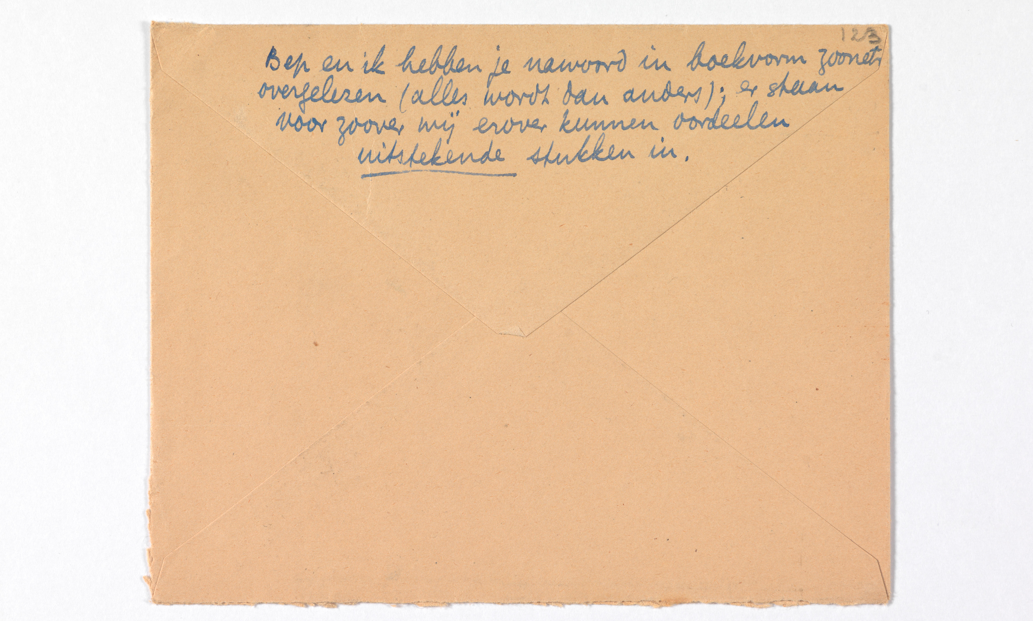 Ik zou het zeer jammer vinden als je kritische bundel niet (spoedig toch, althans betrekkelijk) uitkwam; en haal er nu maar niet te veel uit, dan wordt het droog en mager. - Ik blijf niet bij Stols, omdat hijzelf niet langer zulke dingen kan uitgeven. Jammer dat je zoo creatief-gezind blijft, ik moet nu Goddôme alweer serieus naar een ander zoeken. Menschen genoeg, maar een die er nog iets mee te maken heeft. Ik denk niet dat Bouws op het papier blijft staan,2548 ik ben ‘en froid’ met ZEd.