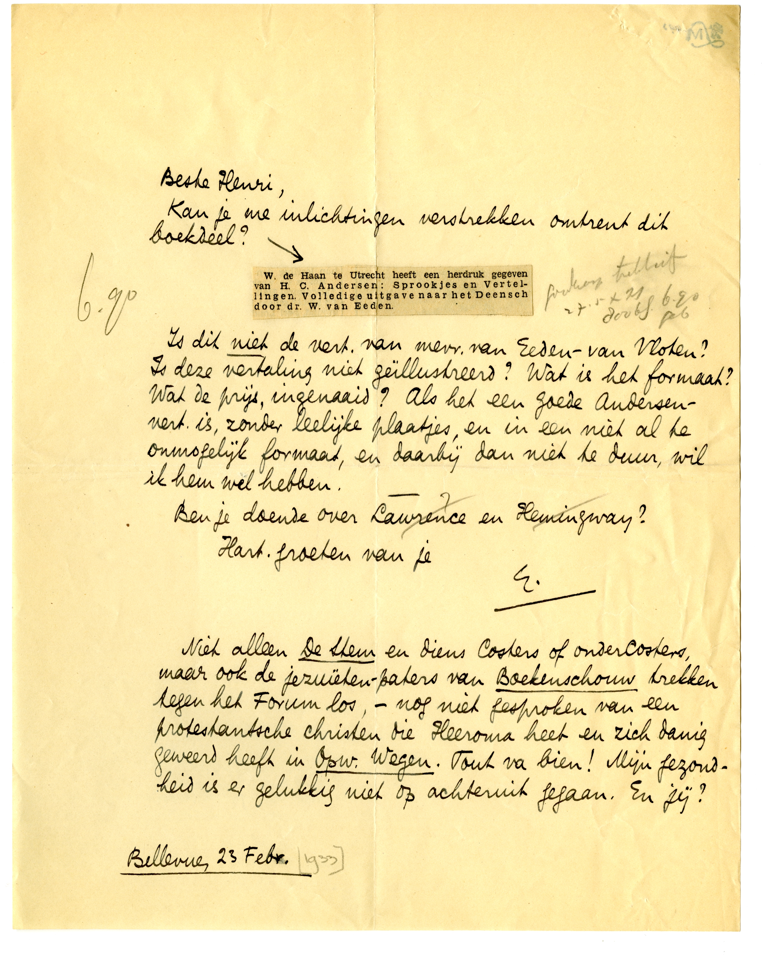 Is dit niet de vert. van mevr. van Eeden-van Vloten? Is deze vertaling niet geïllustreerd? Wat is het formaat? Wat de prijs, ingenaaid? Als het een goede Andersen-vert. is, zonder leelijke plaatjes, en in een niet al te onmogelijk formaat, en daarbij dan niet te duur, wil ik hem wel hebben.