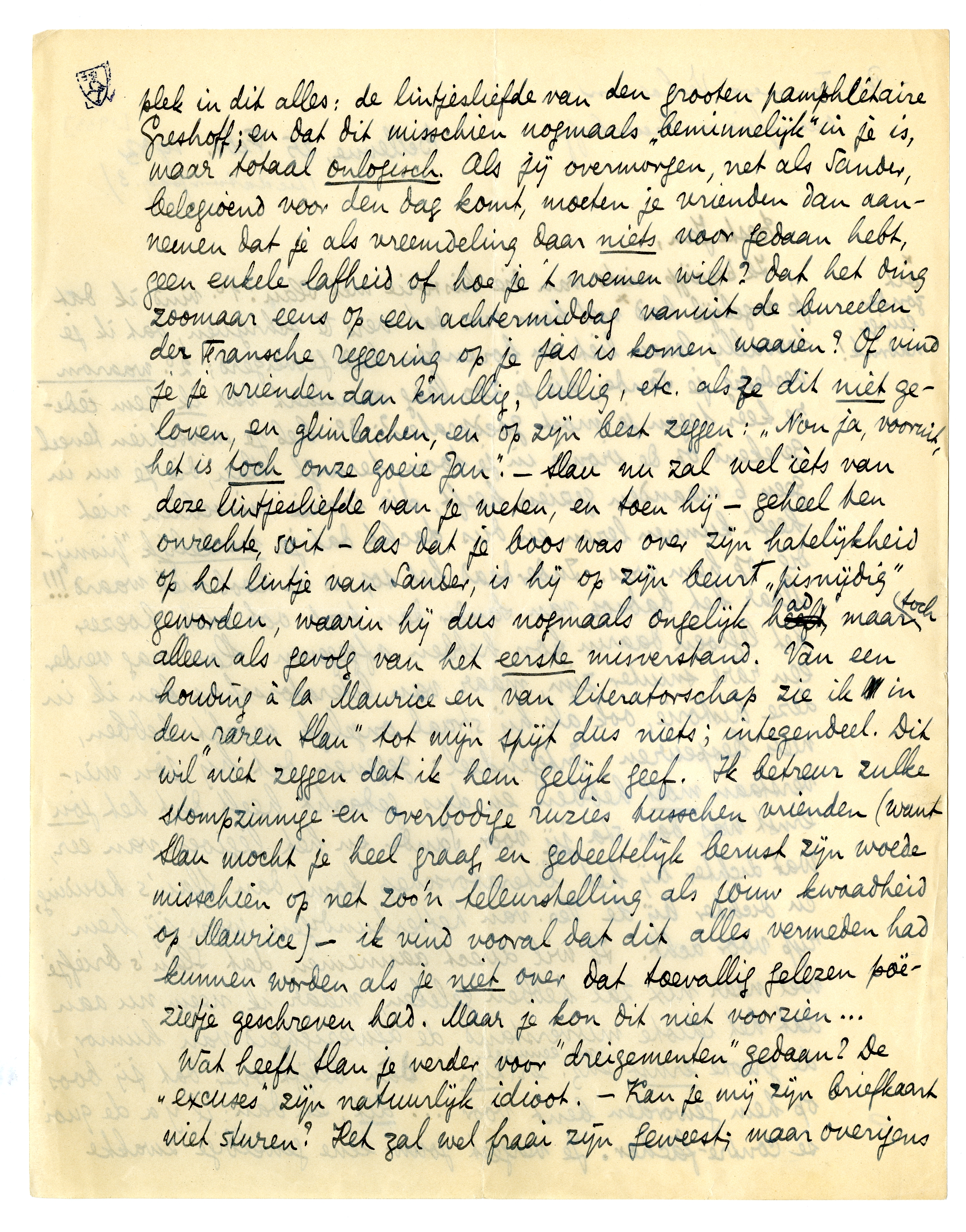 Ik begrijp niets van die historie met Slau!2567 1o. vind ik dat je ongelijk had* met hem over dat vers te schrijven, dat ik je toevallig lezen liet en bovendien had geweigerd; 2o. waarom verdedig je Sander, die je zoo laag aanslaat dat ik hem iedere keer tegen je moet goedpraten?; 3o. heb je misschien teveel gerekend op de ironie in je toon, terwijl Slau, die je nu in geen 6 maanden gezien heeft, die ironie misschien niet heeft kunnen lezen en dus dacht dat je werkelijk ‘pisnijdig’ op hem was. Inderdaad, het sop is de kool niet waard!!! Maar het badsop van Sander dan toch ook niet, hoezeer het legioen daarin kon hebben afgegeven. Slau mag verder een rare snuiter zijn, maar van literatorschap kan ik in deze historie, ook als hij straal ongelijk mocht hebben, niets bespeuren. Integendeel; gegeven dat hij jou misver-staan moet hebben, en dus gedacht heeft dat het jou ernst was, dan sta jij voor Sander en het legioen van eer, wat dichter bij het literatorschap komt dan Slau's houding en dichter bij de Ver. van Letterkundigen, waar jij hem rijp voor acht. Ik wil direct aannemen dat Slau's briefje wel naar nix zal hebben geleken, maar ik neem nu aan dat het idiote misverstand, de afwezigheid van humor, de groote ernst enz. er nu eenmaal zijn! dàn blijft over dat jij boos op hem geworden bent voor.... dit, en dan: il y a de quoi se contre-fâcher. Je vergeet jouw ééne geweldige zwakke plek in dit alles: de lintjesliefde van den grooten pamphlétaire Greshoff; en dat dit misschien nogmaals ‘beminnelijk’ in je is, maar totaal onlogisch. Als jij overmorgen, net als Sander, belegioend voor den dag komt, moeten je vrienden dan aannemen dat je als vreemdeling daar niets voor gedaan hebt, geen enkele lafheid of hoe je 't noemen wilt? dat het ding zoomaar eens op een achtermiddag vanuit de bureelen der Fransche regeering op je jas is komen waaien? Of vind je je vrienden dan knullig, lullig, etc. als ze dit niet geloven, en glimlachen, en op zijn best zeggen: ‘Nou ja, vooruit, het is toch onze goeie Jan’. - Slau nu zal wel ièts van deze lintjesliefde van je weten, en toen hij - geheel ten onrechte, soit - las dat je boos was over zijn hatelijkheid op het lintje van Sander, is hij op zijn beurt ‘pisnijdig’ geworden, waarin hij dus nogmaals ongelijk had, maar toch alleen als gevolg van het eerste misverstand. Van een houding à la Maurice en van literatorschap zie ik in den ‘raren Slau’ tot mijn spijt dus niets; integendeel. Dit wil niet zeggen dat ik hem gelijk geef. Ik betreur zulke stompzinnige en overbodige ruzies tusschen vrienden (want Slau mocht je heel graag, en gedeeltelijk berust zijn woede misschien op net zoo'n teleurstelling als jouw kwaadheid op Maurice) - ik vind vooral dat dit alles vermeden had kunnen worden als je niet over dat toevallig gelezen poëzietje geschreven had. Maar je kon dit niet voorzien...