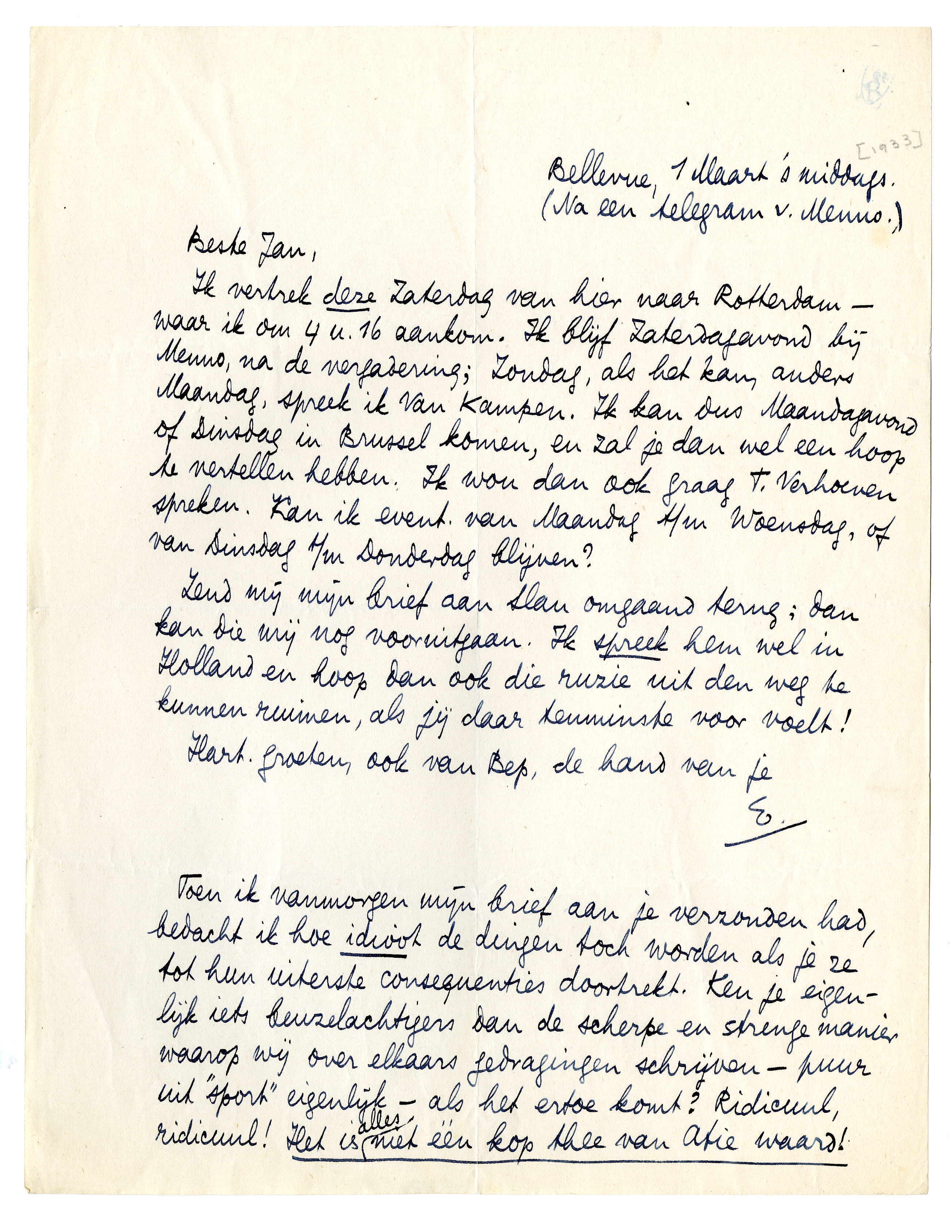 Ik vertrek deze Zaterdag van hier naar Rotterdam - waar ik om 4 u. 16 aankom. Ik blijf Zaterdagavond bij Menno, na de vergadering; Zondag, als het kan, anders Maandag, spreek ik Van Kampen. Ik kan dus Maandagavond of Dinsdag in Brussel komen, en zal je dan wel een hoop te vertellen hebben. Ik wou dan ook graag T. Verhoeven spreken. Kan ik event, van Maandag t/m Woensdag, of van Dinsdag t/m Donderdag blijven?