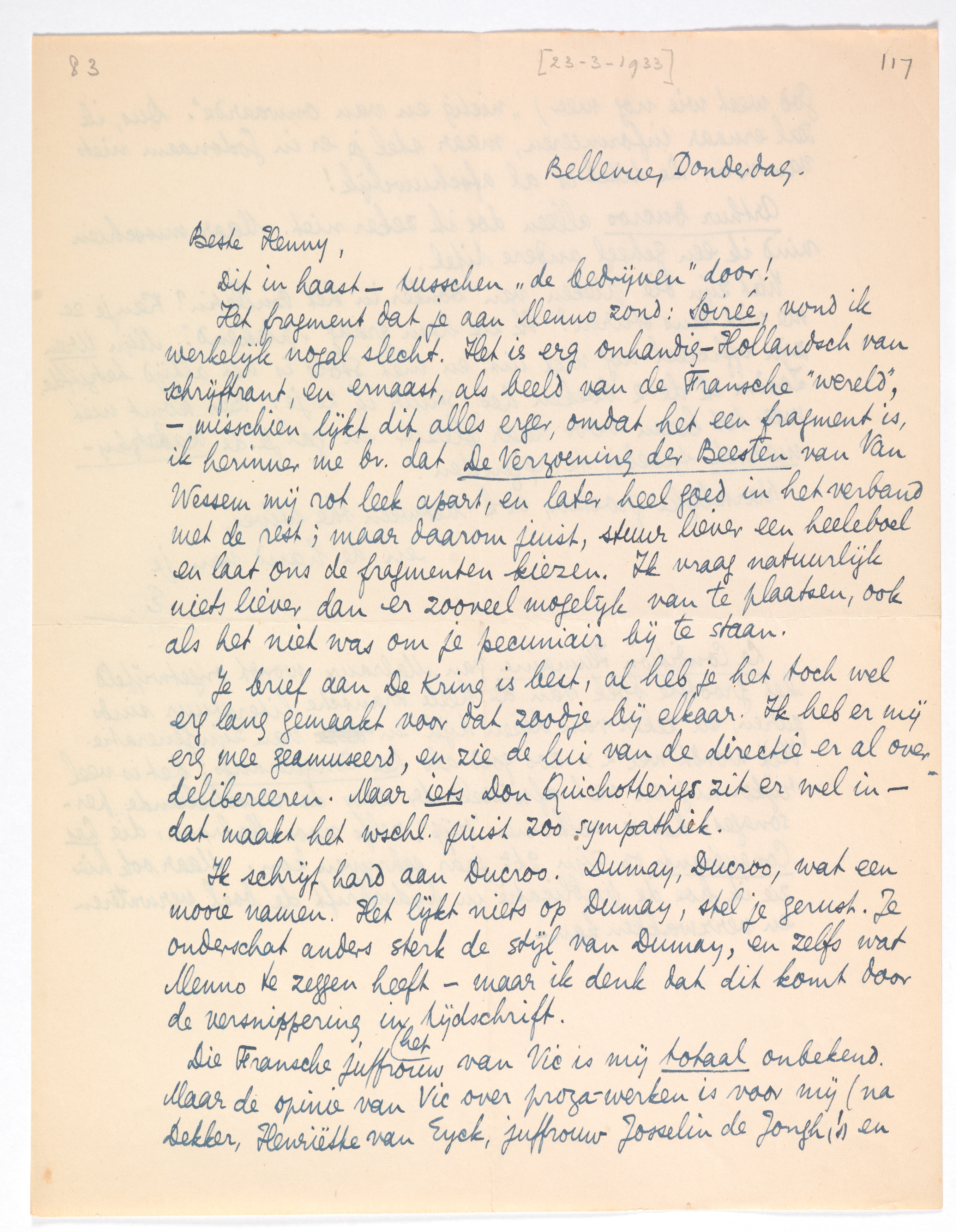 Die Fransche juffrouw van Vic2607 is mij totaal onbekend. Maar de opinie van Vic over proza-werken is voor mij (na Dekker, Henriëtte van Eyck, juffrouw Josselin de Jongh(!)2608 en God weet wie nog meer) ‘nietig en van onwaarde’.2609 Dus, ik zal ernaar informeeren, maar stel je er in Godsnaam niets van voor. De titel is al afschuwelijk!