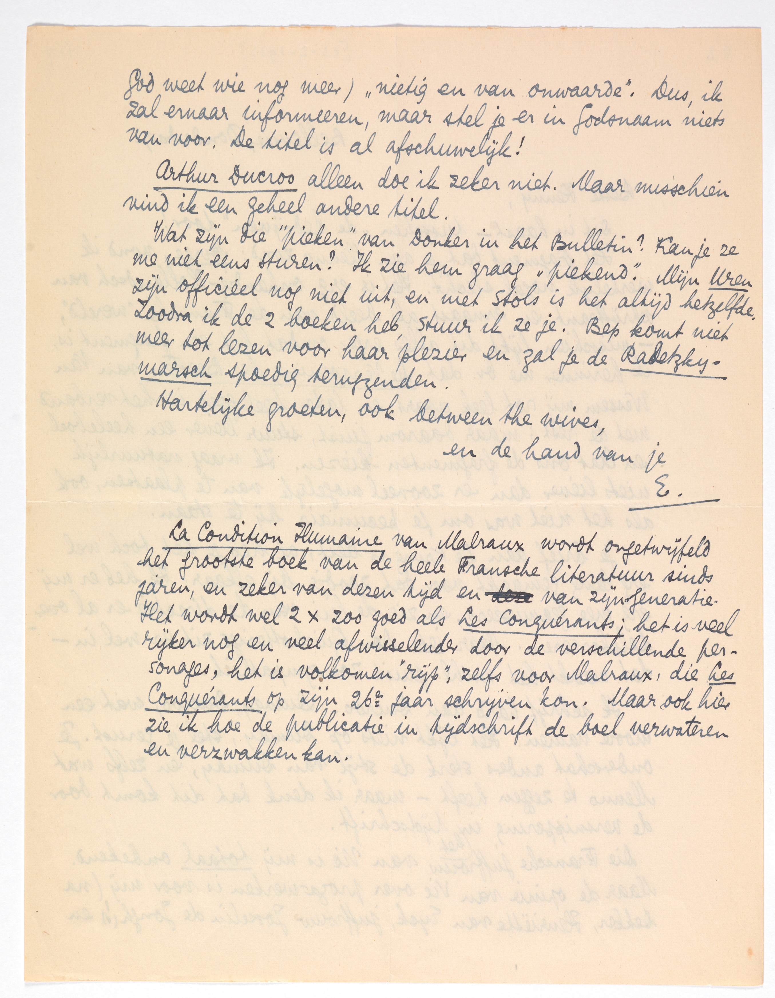 Wat zijn die ‘pieken’ van Donker in het Bulletin?2610 Kan je ze me niet eens sturen? Ik zie hem graag ‘piekend’. Mijn Uren zijn officieel nog niet uit, en met Stols is het altijd hetzelfde. Zoodra ik de 2 boeken2611 heb, stuur ik ze je. Bep komt niet meer tot lezen voor haar plezier en zal je de Radetzky-marsch spoedig terugzenden.