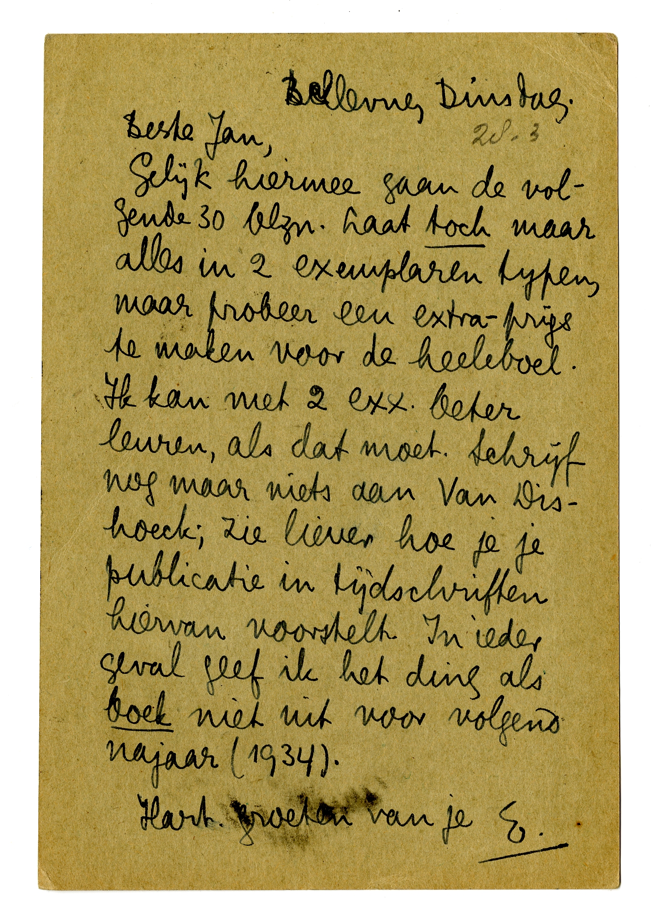 Gelijk hiermee gaan de volgende 30 blzn. Laat toch maar alles in 2 exemplaren typen, maar probeer een extra-prijs te maken voor de heeleboel. Ik kan met 2 exx. beter leuren, als dat moet. Schrijf nog maar niets aan Van Dishoeck; zie liever hoe je je publicatie in tijdschriften hiervan voorstelt. In ieder geval geef ik het ding als boek niet uit voor volgend najaar (1934).