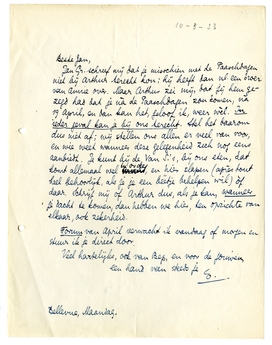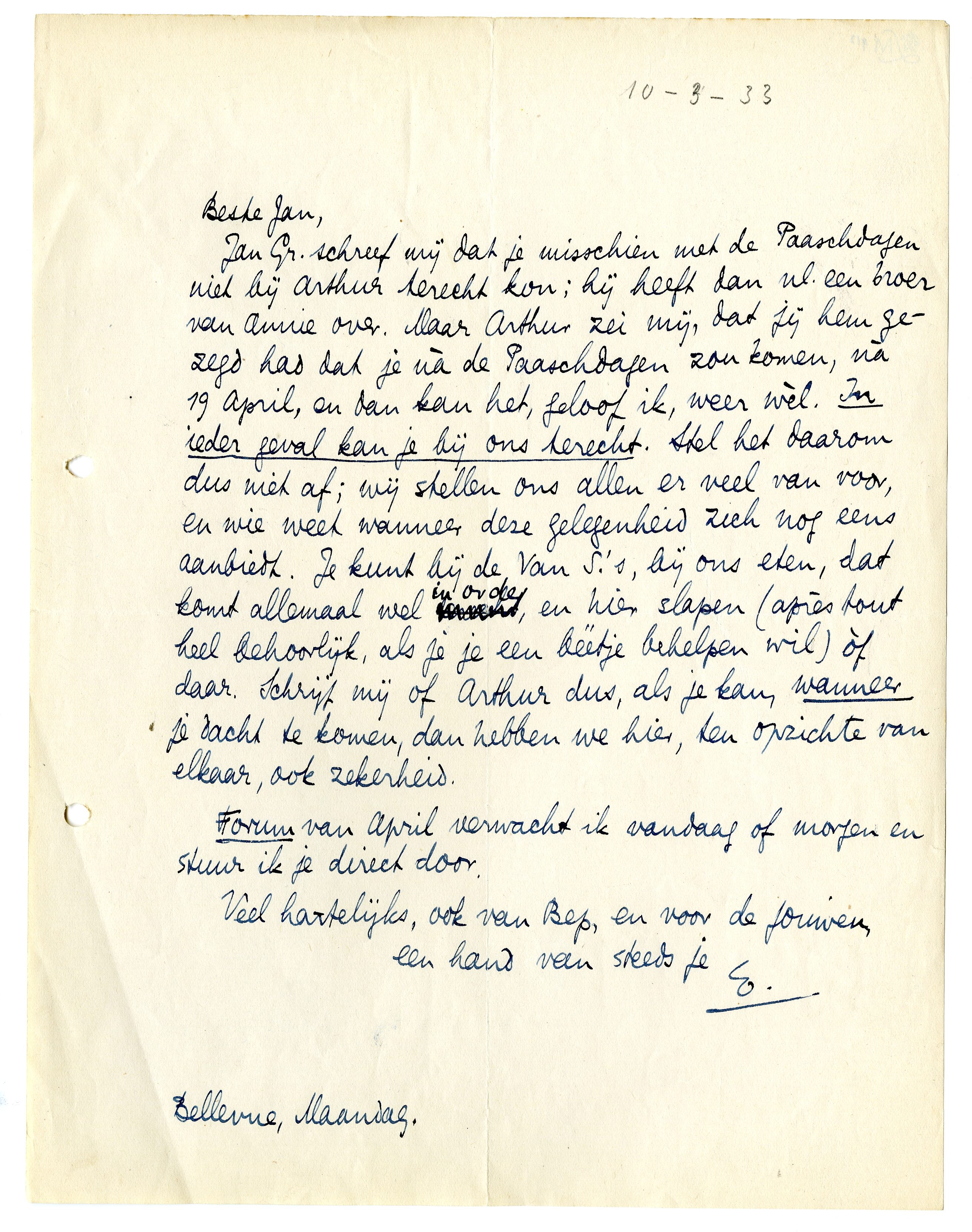 Jan Gr. schreef mij dat je misschien met de Paaschdagen niet bij Arthur terecht kon; hij heeft dan nl. een broer van Annie over. Maar Arthur zei mij, dat jij hem gezegd had dat je nà de Paaschdagen zou komen, nà 19 April, en dan kan het, geloof ik, weer wèl. In ieder geval kan je bij ons terecht. Stel het daarom dus niet af; wij stellen ons allen er veel van voor, en wie weet wanneer deze gelegenheid zich nog eens aanbiedt. Je kunt bij de Van S.'s, bij ons eten, dat komt allemaal wel in orde, en hier slapen (après tout heel behoorlijk, als je je een béétje behelpen wil) òf daar. Schrijf mij of Arthur dus, als je kan, wanneer je dacht te komen, dan hebben we hier, ten opzichte van elkaar, ook zekerheid.
