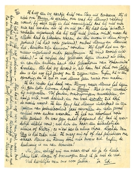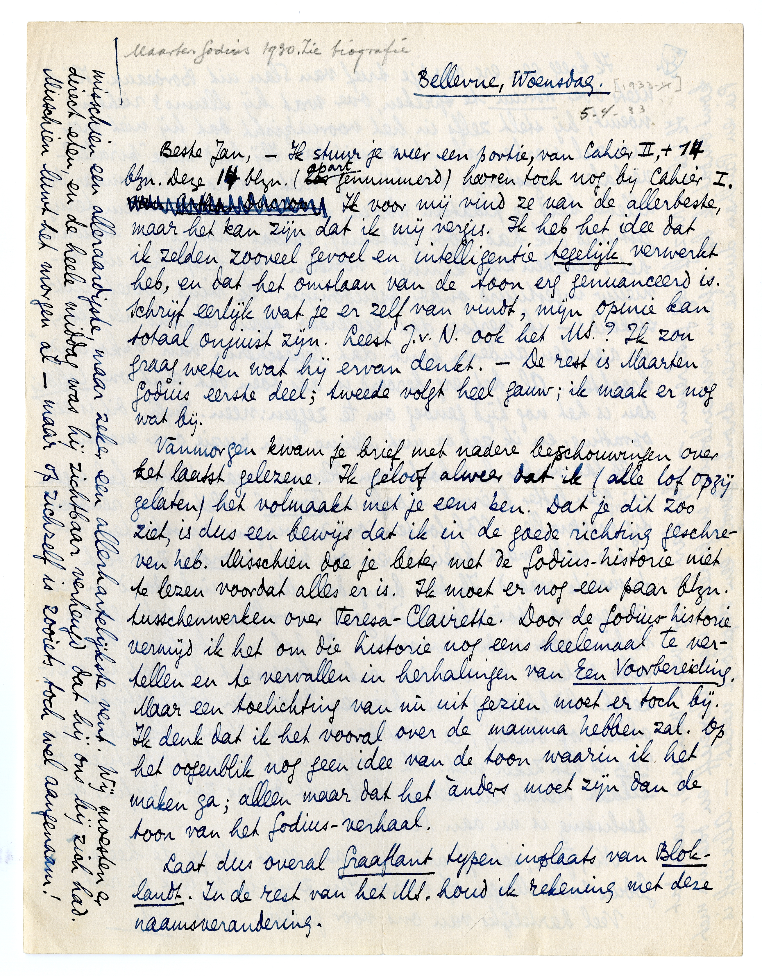 Beste Jan, - Ik stuur je weer een portie, van Cahier II, + 14 blzn. Deze 14 blzn. (apart genummerd) hooren toch nog bij Cahier I. Ik voor mij vind ze van de allerbeste, maar het kan zijn dat ik mij vergis. Ik heb het idee dat ik zelden zooveel gevoel en intelligentie tegelijk verwerkt heb, en dat het omslaan van de toon erg genuanceerd is. Schrijf eerlijk wat je er zelf van vindt, mijn opinie kan totaal onjuist zijn. Leest J.v.N. ook het MS.? Ik zou graag weten wat hij ervan denkt. - De rest is Maarten Godius eerste deel; tweede volgt heel gauw; ik maak er nog wat bij.