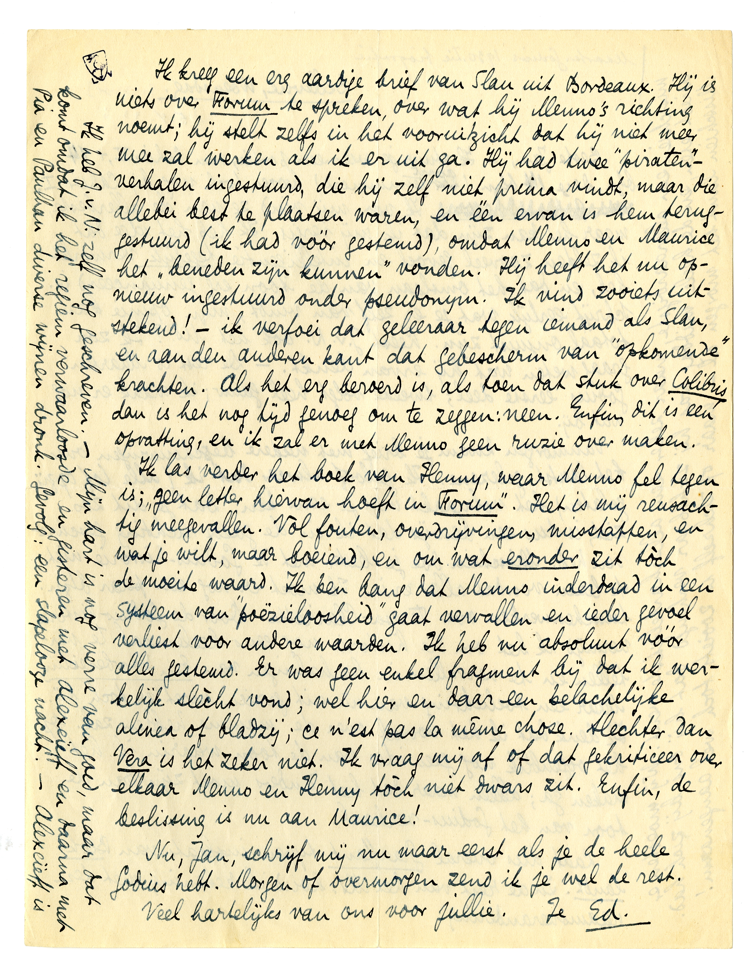 Ik las verder het boek van Henny, waar Menno fel tegen is; ‘geen letter hiervan hoeft in Forum’. Het is mij reusachtig meegevallen. Vol fouten, overdrijvingen, misstappen, en wat je wilt, maar boeiend, en om wat eronder zit tòch de moeite waard. Ik ben bang dat Menno inderdaad in een systeem van ‘poëzieloosheid’ gaat vervallen en ieder gevoel verliest voor andere waarden. Ik heb nu absoluut vóór alles gestemd. Er was geen enkel fragment bij dat ik werkelijk slècht vond; wel hier en daar een belachelijke alinea of bladzij; ce n'est pas la même chose. Slechter dan Vera is het zeker niet. Ik vraag mij af of dat gekriticeer over elkaar Menno en Henny tòch niet dwars zit. Enfin, de beslissing is nu aan Maurice!