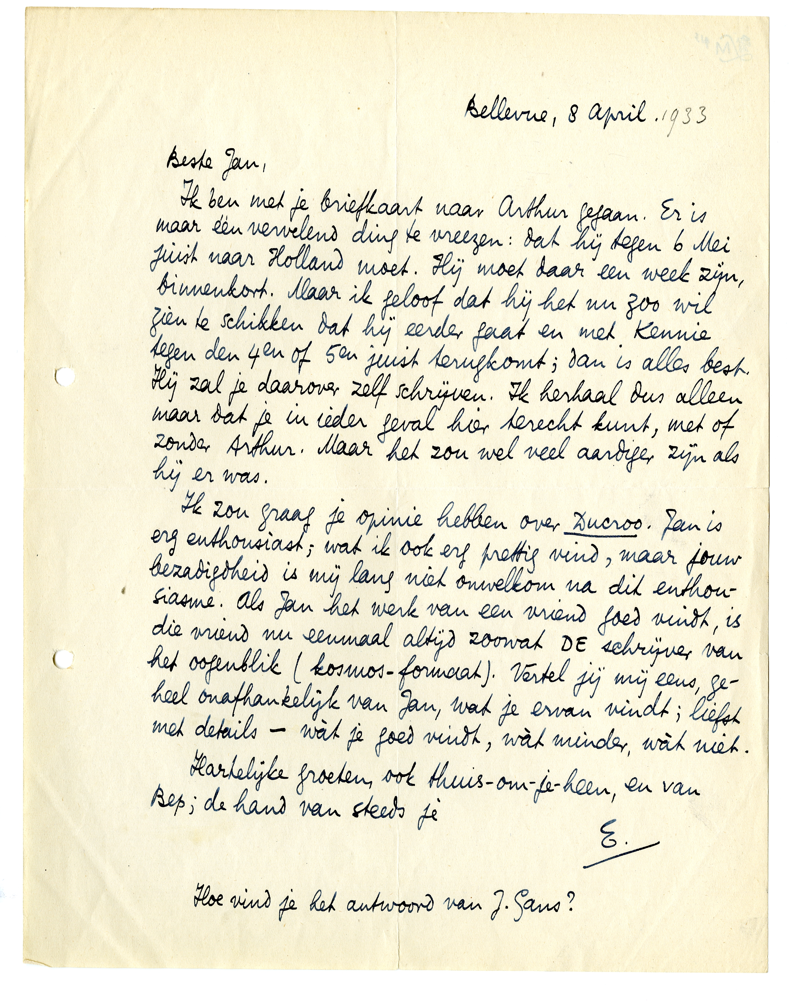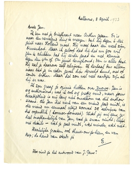 Ik ben met je briefkaart naar Arthur gegaan. Er is maar één vervelend ding te vreezen: dat hij tegen 6 Mei juist naar Holland moet. Hij moet daar een week zijn, binnenkort. Maar ik geloof dat hij het nu zoo wil zien te schikken dat hij eerder gaat en met Kennie tegen den 4en of 5en juist terugkomt; dan is alles best. Hij zal je daarover zelf schrijven. Ik herhaal dus alleen maar dat je in ieder geval hier terecht kunt, met of zonder Arthur. Maar het zou wel veel aardiger zijn als hij er was.