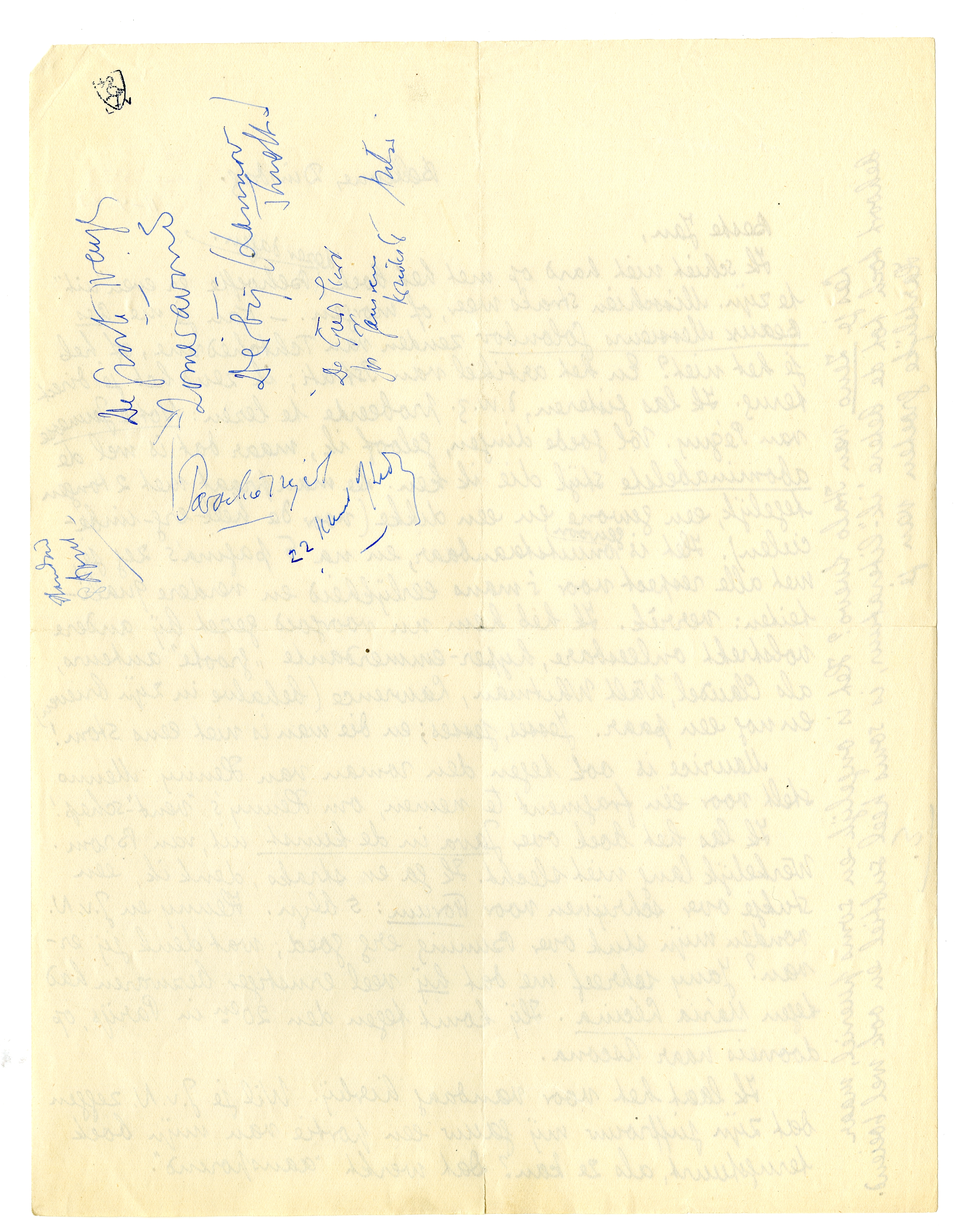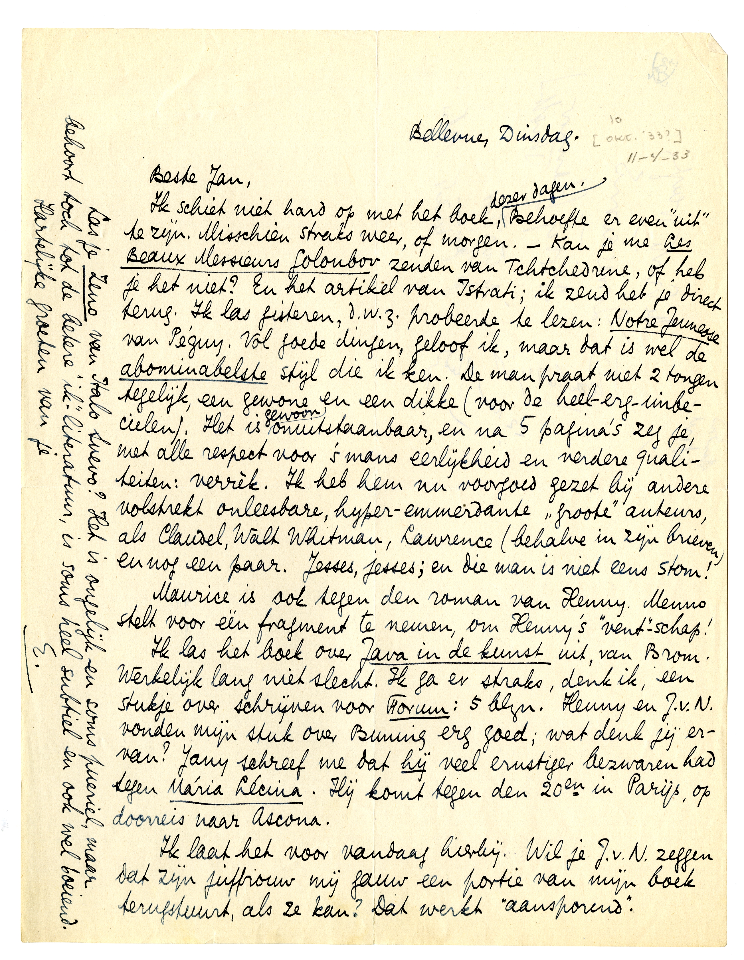 Ik schiet niet hard op met het boek, dezer dagen. Behoefte er even ‘uit’ te zijn. Misschien straks weer, of morgen. - Kan je me Les Beaux Messieurs Goloubov zenden van Tchtchedrine, of heb je het niet? En het artikel van Istrati; ik zend het je direct terug. Ik las gisteren, d.w.z. probeerde te lezen: Notre Jeunesse van Péguy. Vol goede dingen, geloof ik, maar dat is wel de abominabelste stijl die ik ken. De man praat met 2 tongen tegelijk, een gewone en een dikke (voor de heelerg-imbecielen). Het is gewoon onuitstaanbaar, en na 5 pagina's zeg je, met alle respect voor 's mans eerlijkheid en verdere qualiteiten: verrèk. Ik heb hem nu voorgoed gezet bij andere volstrekt onleesbare, hyper-emmerdante ‘groote’ auteurs, als Claudel, Walt Whitman, Lawrence (behalve in zijn brieven) en nog een paar. Jesses, jesses; en die man is niet eens stom!