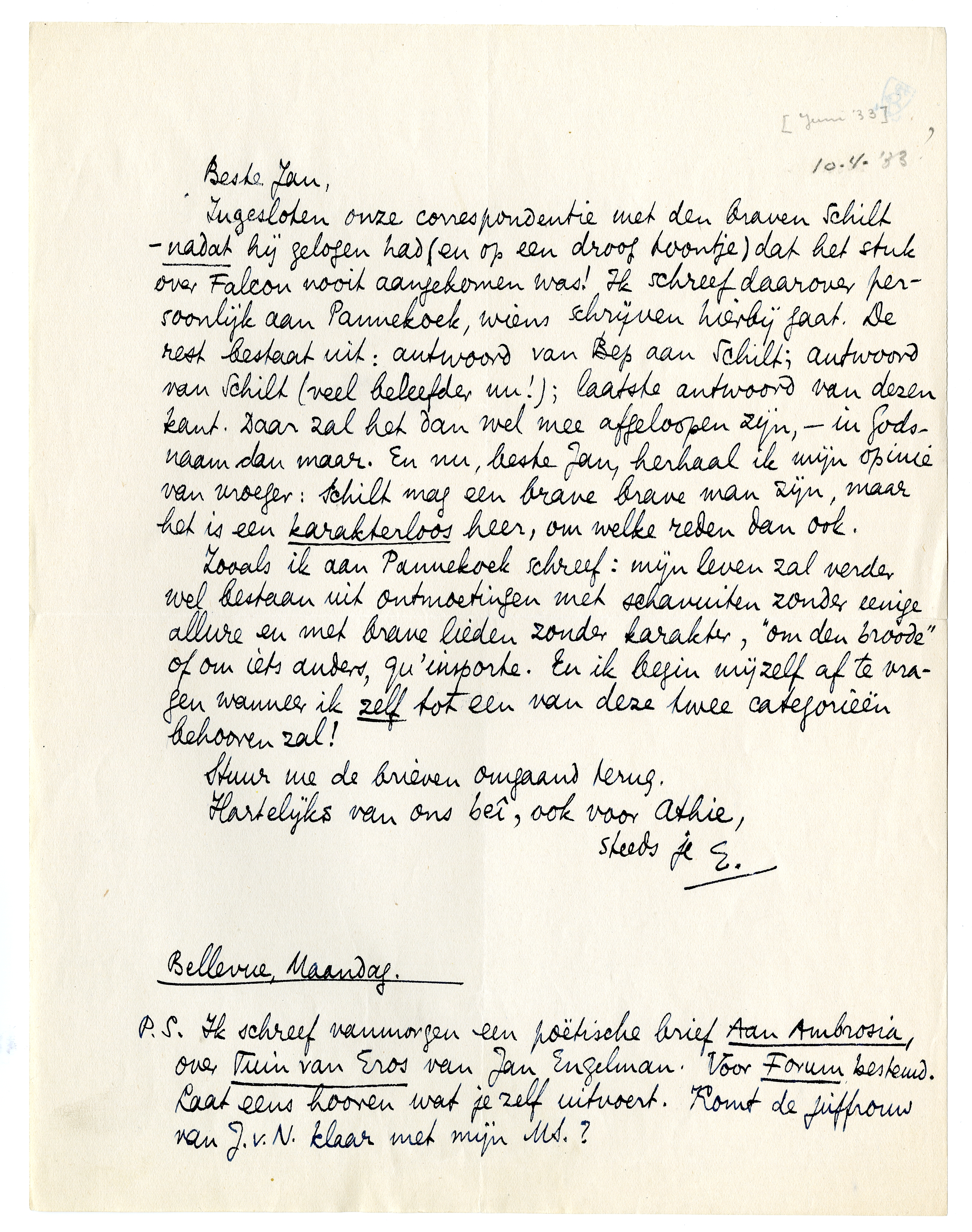 Ingesloten onze correspondentie met den braven Schilt - nadat hij gelogen had (en op een droog toontje) dat het stuk over Falcon nooit aangekomen was! Ik schreef daarover persoonlijk aan Pannekoek, wiens schrijven hierbij gaat. De rest bestaat uit: antwoord van Bep aan Schilt; antwoord van Schilt (veel beleefder nu!); laatste antwoord van deze kant. Daar zal het dan wel mee afgeloopen zijn, - in Godsnaam dan maar. En nu, beste Jan, herhaal ik mijn opinie van vroeger: Schilt mag een brave brave man zijn, maar het is een karakterloos heer, om welke reden dan ook.