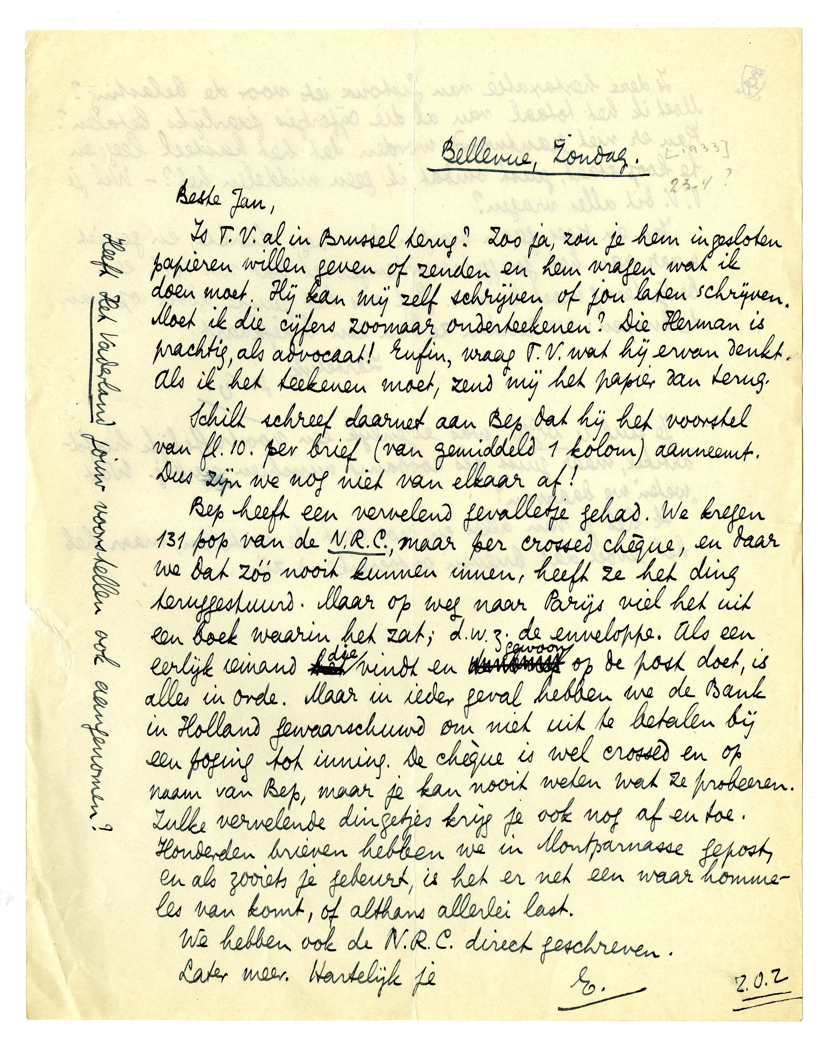 Bep heeft een vervelend gevalletje gehad. We kregen 131 pop van de N.R.C., maar per crossed chèque, en daar we dat zóó nooit kunnen innen, heeft ze het ding teruggestuurd. Maar op weg naar Parijs viel het uit een boek waarin het zat; d.w.z. de enveloppe. Als een eerlijk iemand die vindt en gewoon op de post doet, is alles in orde. Maar in ieder geval hebben we de Bank in Holland gewaarschuwd om niet uit te betalen bij een poging tot inning. De chèque is wel crossed en op naam van Bep, maar je kan nooit weten wat ze probeeren. Zulke vervelende dingetjes krijg je ook nog af en toe. Honderden brieven hebben we in Montparnasse gepost, en als zooiets je gebeurt, is het er net een waar hommeles van komt, of althans allerlei last.