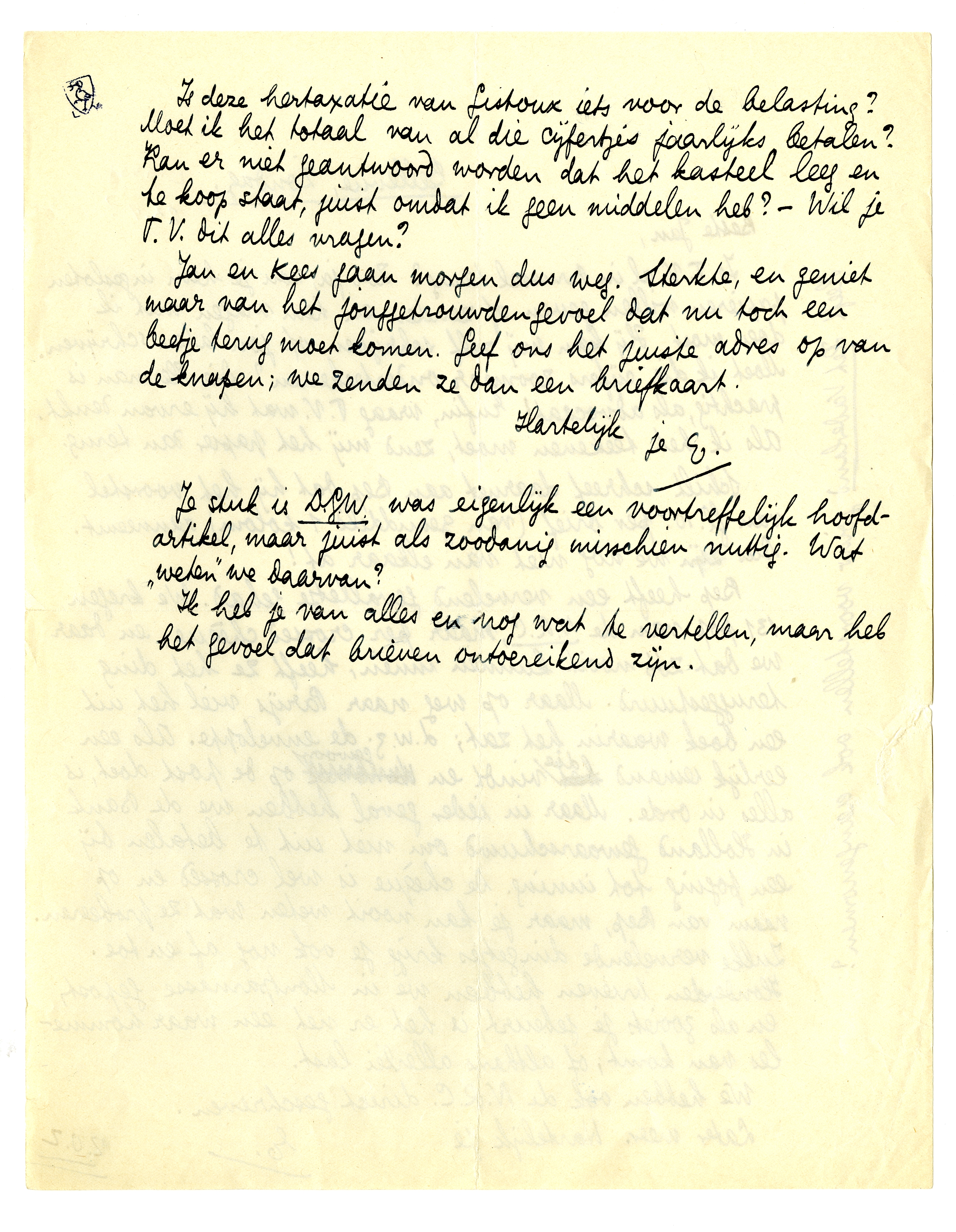 Is T.V. al in Brussel terug? Zoo ja, zou je hem ingesloten papieren willen geven of zenden en hem vragen wat ik doen moet. Hij kan mij zelf schrijven of jou laten schrijven. Moet ik die cijfers zoomaar onderteekenen? Die Herman is prachtig, als advocaat! Enfin, vraag T.V. wat hij ervan denkt. Als ik het teekenen moet, zend mij het papier dan terug.