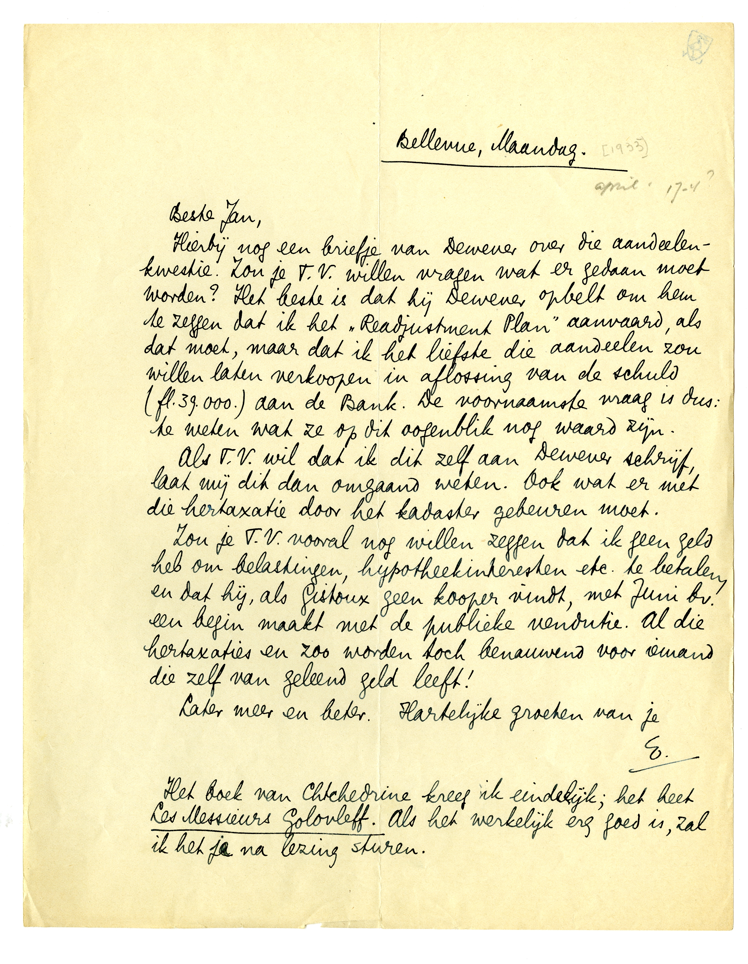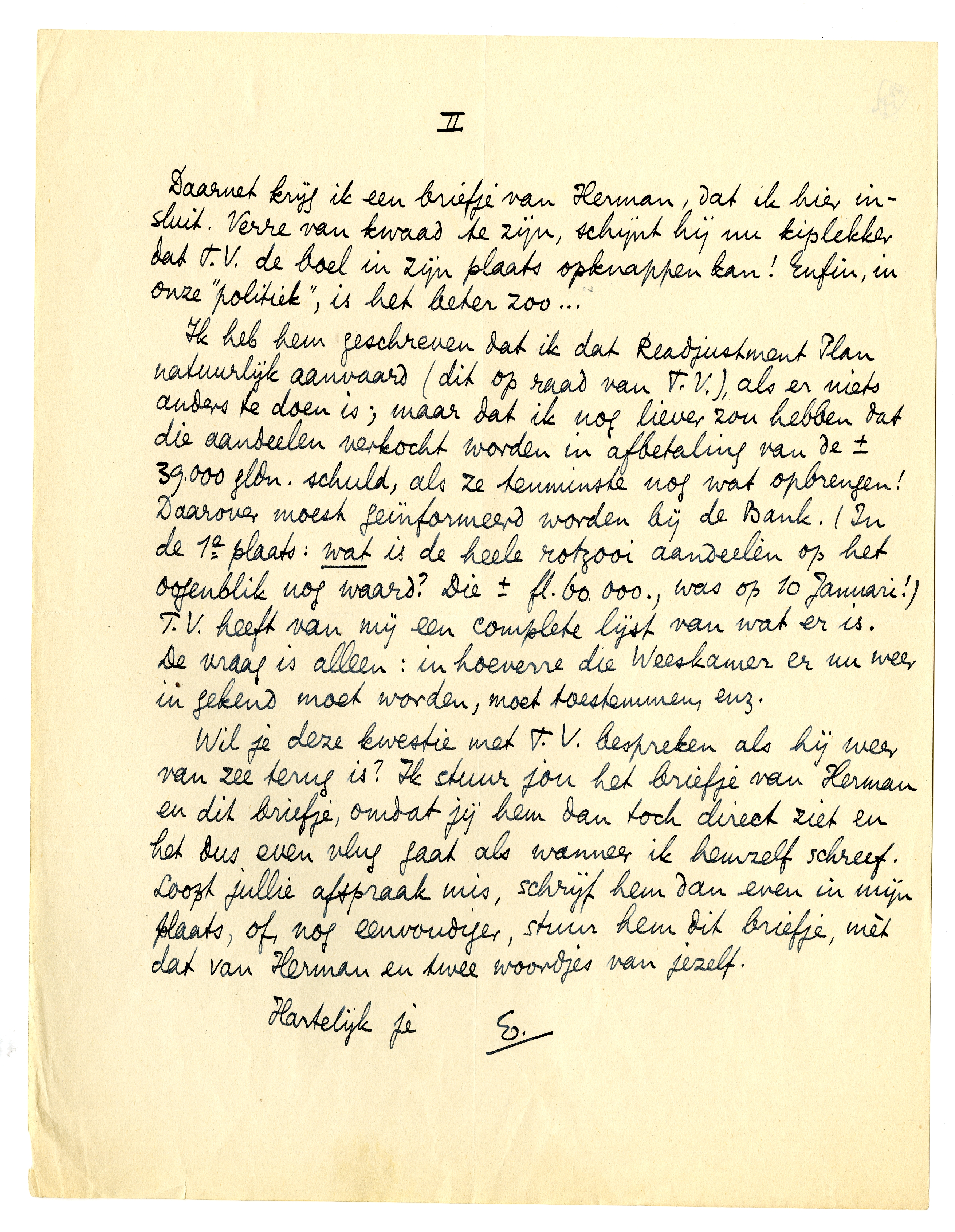 Hierbij nog een briefje van Dewever over die aandeelenkwestie. Zou je T.V. willen vragen wat er gedaan moet worden? Het beste is dat hij Dewever opbelt om hem te zeggen dat ik het ‘Readjustment Plan’ aanvaard, als dat moet, maar dat ik het liefste die aandeelen zou willen laten verkoopen in aflossing van de schuld (fl. 39.000.) aan de Bank. De voornaamste vraag is dus: te weten wat ze op dit oogenblik nog waard zijn.