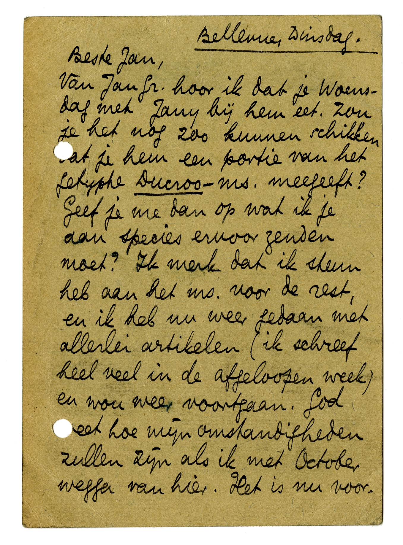 Van Jan Gr. hoor ik dat je Woensdag met Jany bij hem eet. Zou je het nog zoo kunnen schikken dat je hem een portie van het getypte Ducroo-ms. meegeeft? Geef je me dan op wat ik je aan species ervoor zenden moet? Ik merk dat ik steun heb aan het ms. voor de rest, en ik heb nu weer gedaan met allerlei artikelen (ik schreef heel veel in de afgeloopen week) en wou weer voortgaan. God weet hoe mijn omstandigheden zullen zijn als ik met October wegga van hier. Het is nu vooral heerlijk hier met al het nieuwe groen. We stellen er ons erg veel van voor om met je rond te loopen, niet alleen in Parijs, maar ook hier. Het is hier werkelijk la douce France bij uitstek, veel meer dan in andere oorden van de Parijsche banlieue, dat zien we telkens weer.