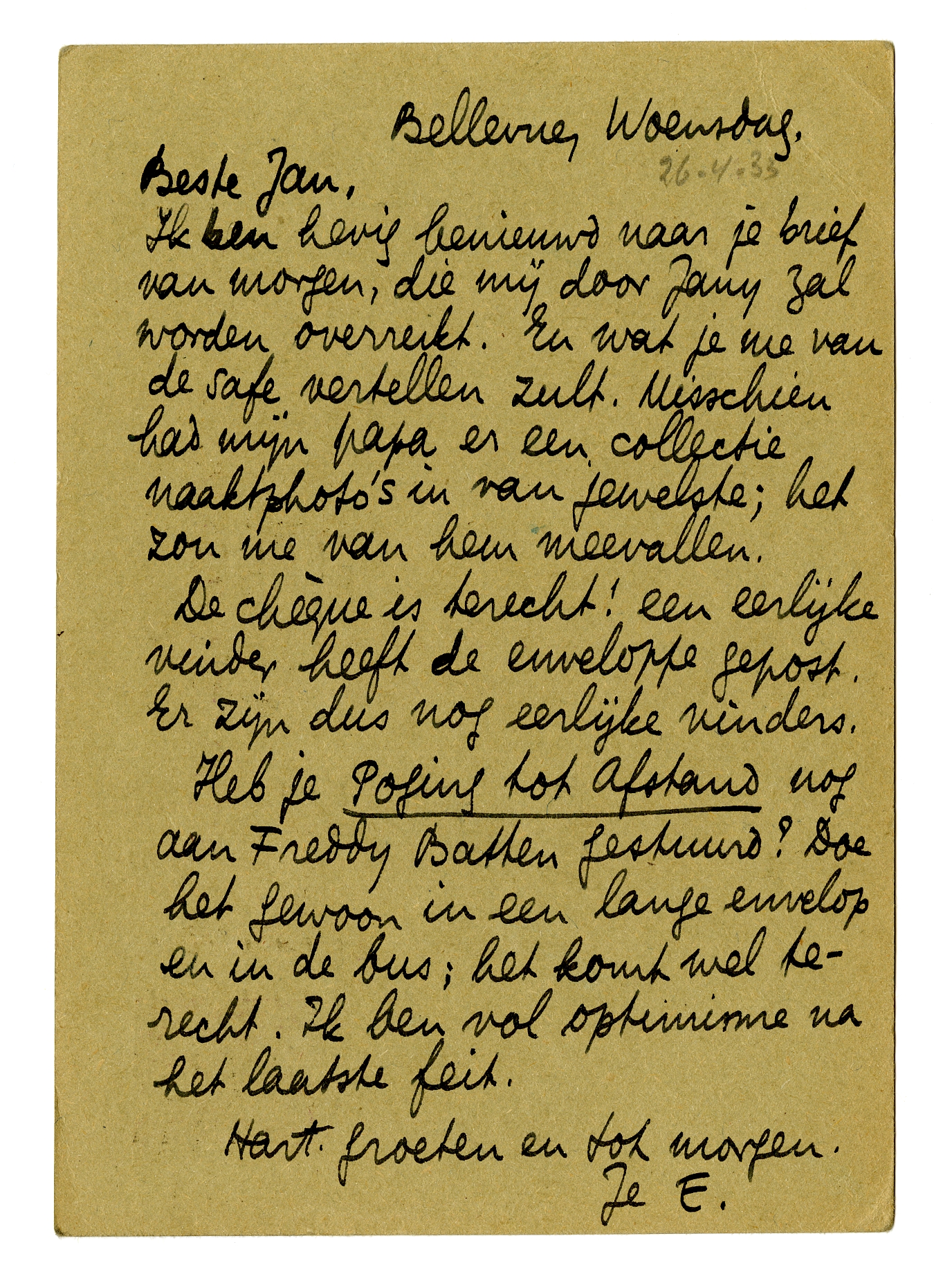 Ik ben hevig benieuwd naar je brief van morgen, die mij door Jany zal worden overreikt. En wat je me van de safe vertellen zult. Misschien had mijn papa er een collectie naaktphoto's in van jewelste; het zou me van hem meevallen.