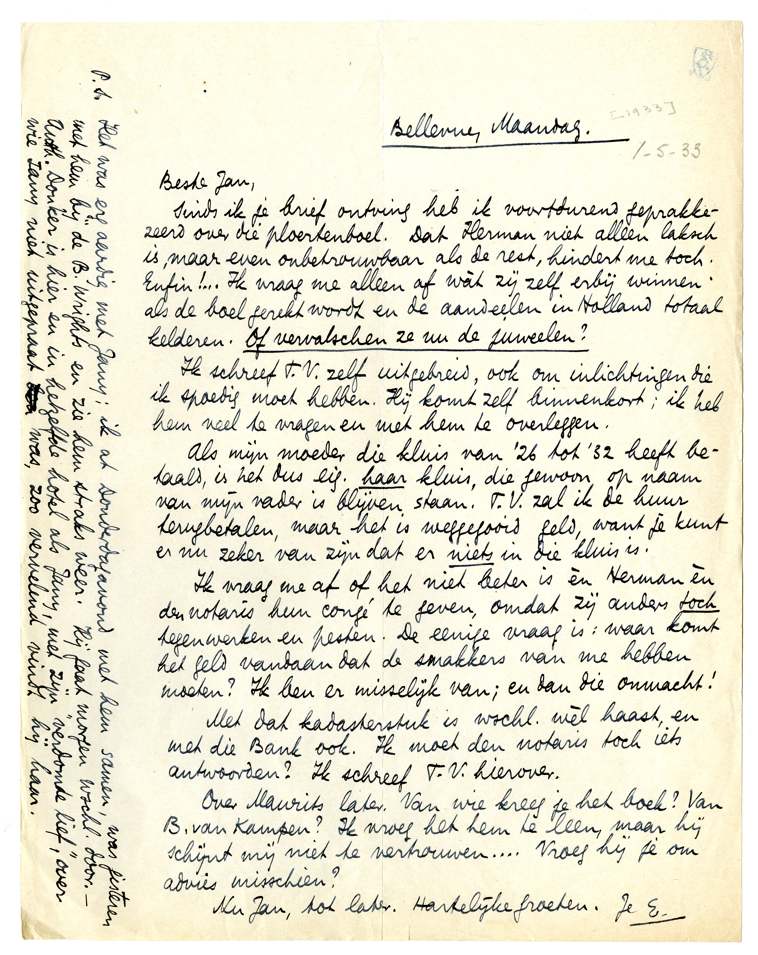 Sinds ik je brief ontving heb ik voortdurend geprakkezeerd over die ploertenboel. Dat Herman niet alleen laksch is, maar even onbe-trouwbaar als de rest, hindert me toch. Enfin!... Ik vraag me alleen af wàt zij zelf erbij winnen als de boel gerekt wordt en de aandeelen in Holland totaal kelderen. Of vervalschen ze nu de juweelen?