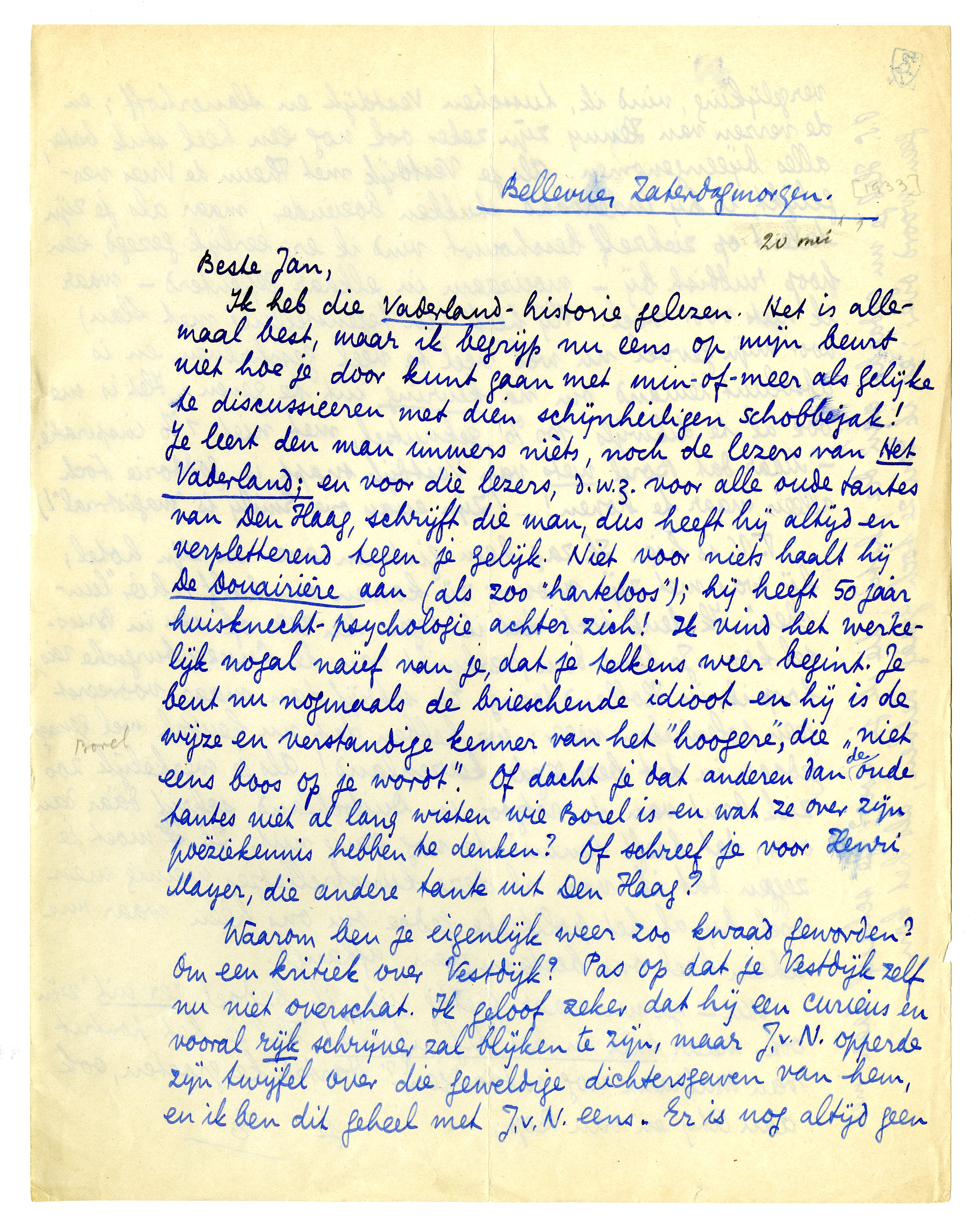 Ik heb die Vaderland-historie2721 gelezen. Het is allemaal best, maar ik begrijp nu eens op mijn beurt niet hoe je door kunt gaan met min-of-meer als gelijke te discussieeren met dien schijnheiligen schobbejak! Je leert den man immers nièts, noch de lezers van Het Vaderland; en voor diè lezers, d.w.z. voor alle oude tantes van Den Haag, schrijft die man, dus heeft hij altijd en verpletterend tegen je gelijk. Niet voor niets haalt hij De Douairière aan (als zoo ‘harteloos’); hij heeft 50 jaar huisknecht-psychologie achter zich! Ik vind het werkelijk nogal naïef van je, dat je telkens weer begint. Je bent nu nogmaals de brieschende idioot en hij is de wijze en verstandige kenner van het ‘hoogere’, die ‘niet eens boos op je wordt’. Of dacht je dat anderen dan de oude tantes niet al lang wisten wie Borel is en wat ze over zijn poëziekennis hebben te denken? Of schreef je voor Henri Mayer, die andere tante uit Den Haag?