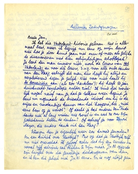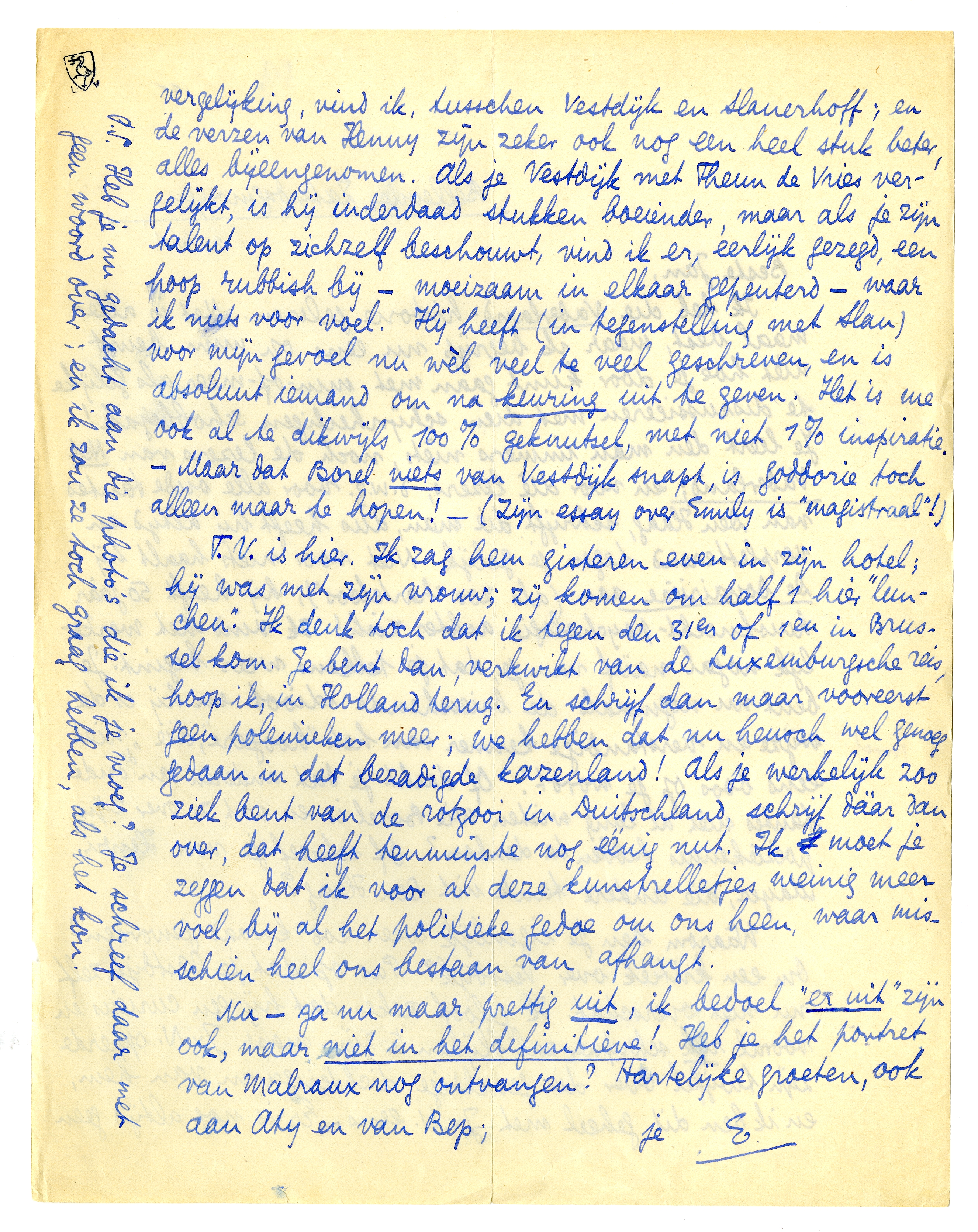 T.V. is hier. Ik zag hem gisteren even in zijn hotel; hij was met zijn vrouw; zij komen om half 1 hier ‘lunchen’. Ik denk toch dat ik tegen den 31en of 1en in Brussel kom. Je bent dan, verkwikt van de Luxemburgsche reis, hoop ik, in Holland terug. En schrijf dan maar vooreerst geen polemieken meer; we hebben dat nu heusch wel genoeg gedaan in dat bezadigde kazenland! Als je werkelijk zoo ziek bent van de rotzooi in Duitschland, schrijf dààr dan over, dat heeft tenminste nog éénig nut. Ik moet je zeggen dat ik voor al deze kunstrelletjes weinig meer voel, bij al het politieke gedoe om ons heen, waar misschien heel ons bestaan van afhangt.