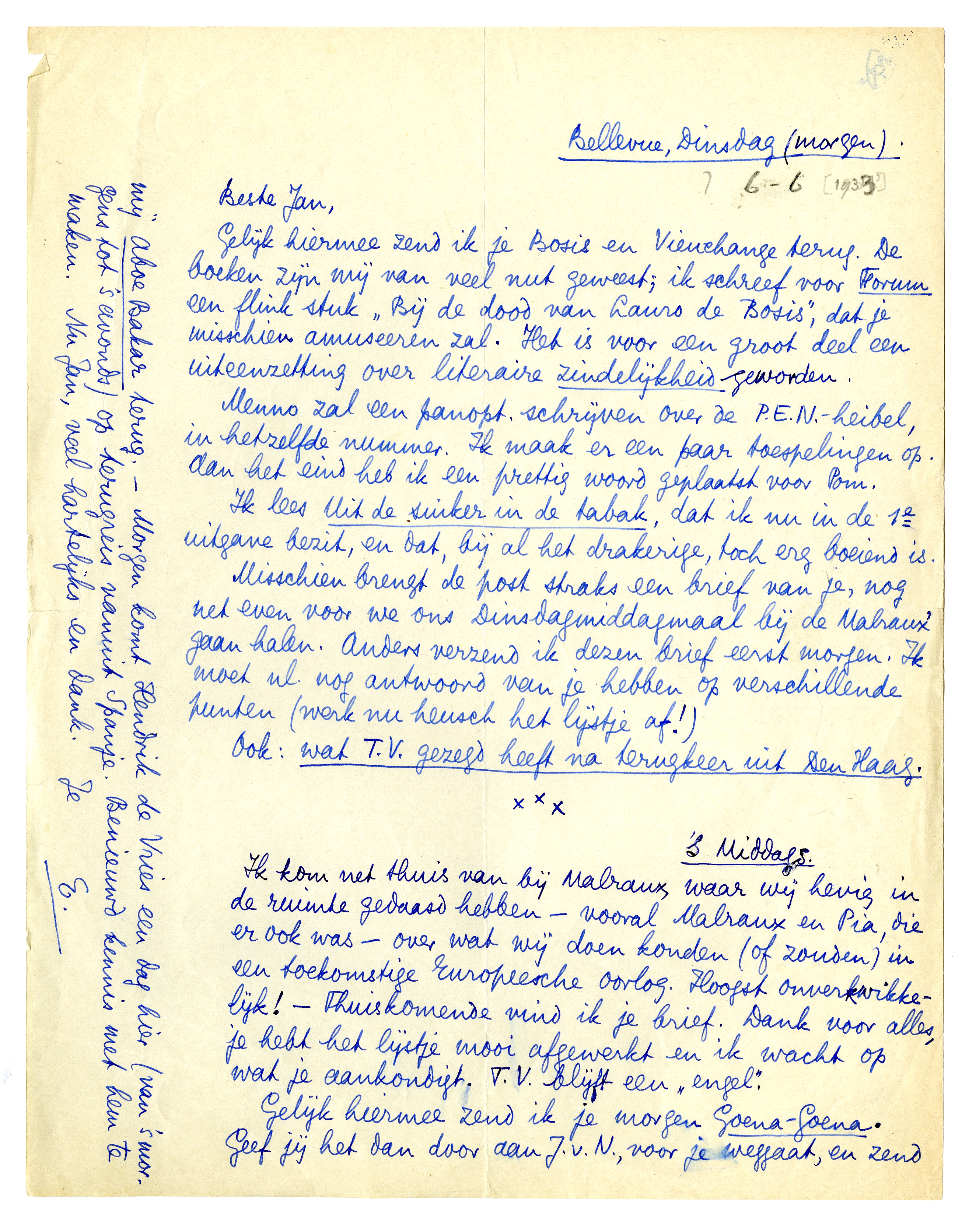 Ik kom net thuis van bij Malraux, waar wij hevig in de ruimte gedaasd hebben - vooral Malraux en Pia, die er ook was - over wat wij doen konden (of zouden) in een toekomstige Europeesche oorlog. Hoogst onverkwikkelijk! - Thuiskomende vind ik je brief. Dank voor alles, je hebt het lijstje mooi afgewerkt en ik wacht op wat je aankondigt. T.V. blijft een ‘engel’.