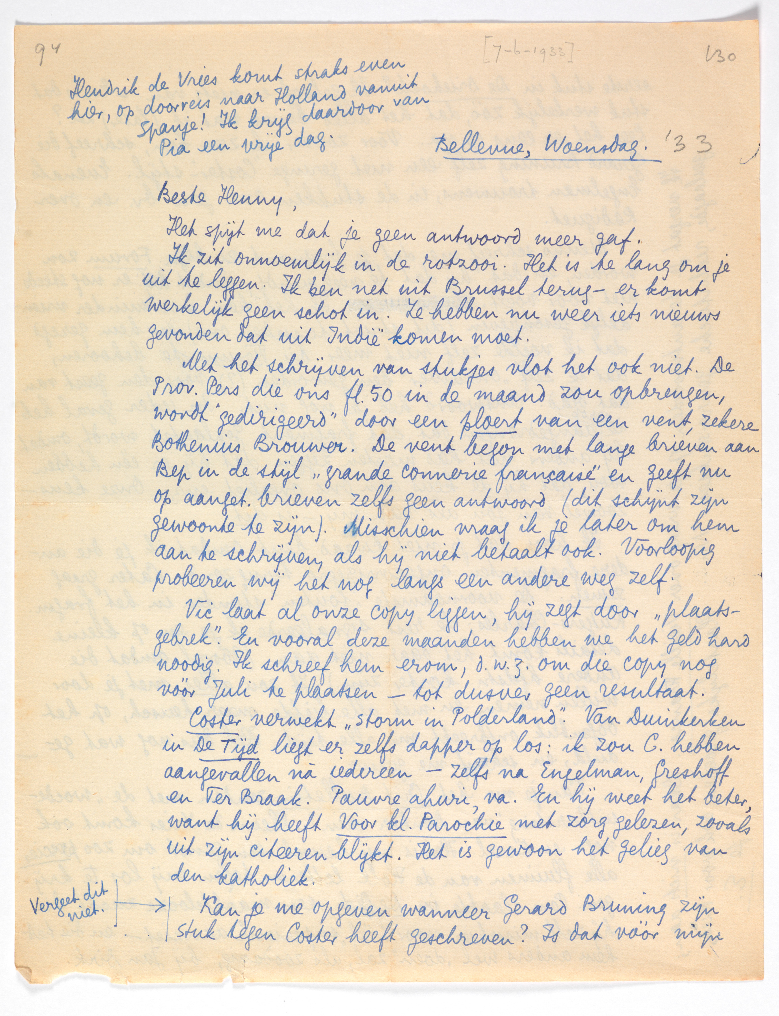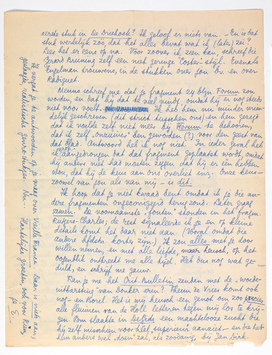 Met het schrijven van stukjes vlot het ook niet. De Prov. Pers die ons fl. 50 in de maand zou opbrengen, wordt ‘gedirigeerd’ door een ploert van een vent, zekere Bothenius Brouwer. De vent begon met lange brieven aan Bep in de stijl ‘grande connerie française’ en geeft nu op aanget. brieven zelfs geen antwoord (dit schijnt zijn gewoonte te zijn). Misschien vraag ik je later om hem aan te schrijven, als hij niet betaalt ook. Voorloopig probeeren wij het nog langs een andere weg zelf.