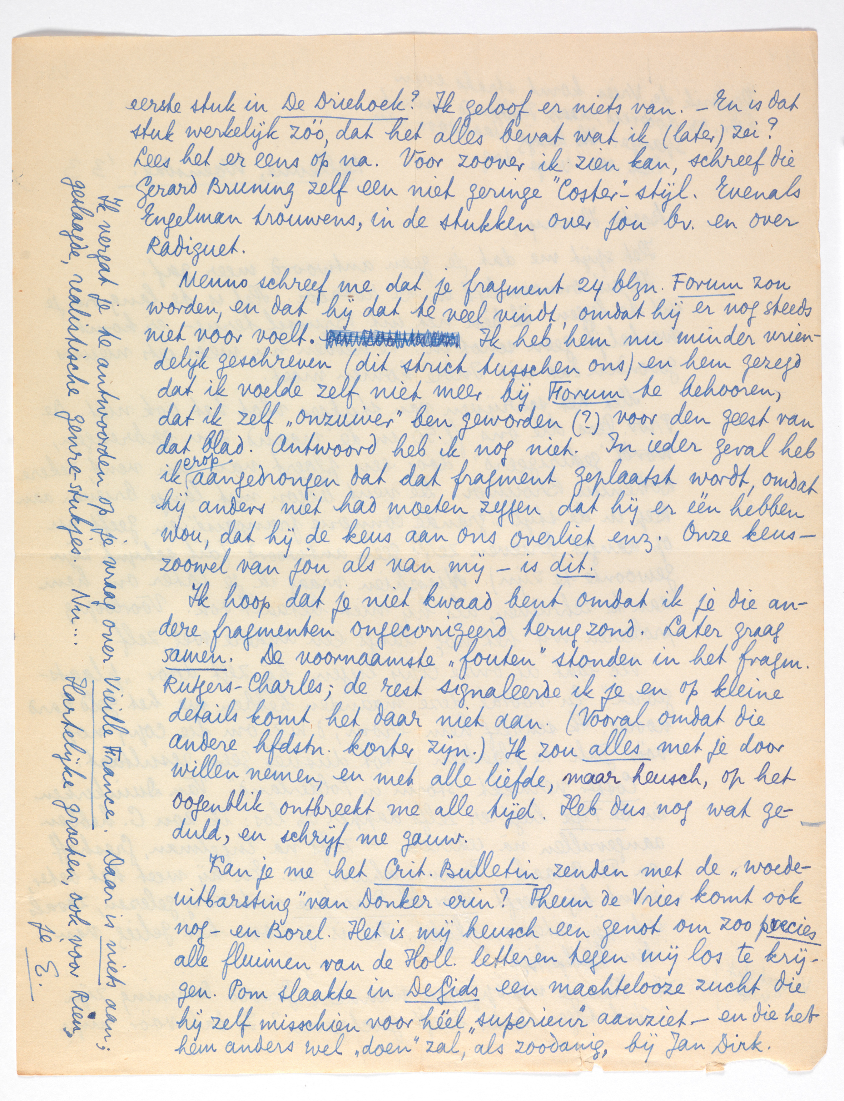 Menno schreef me dat je fragment2753 24 blzn. Forum zou worden, en dat hij dat te veel vindt, omdat hij er nog steeds niet voor voelt. Ik heb hem nu minder vriendelijk geschreven2754 (dit strict tusschen ons) en hem gezegd dat ik voelde zelf niet meer bij Forum te behooren, dat ik zelf ‘onzuiver’ ben geworden (?) voor den geest van dat blad. Antwoord heb ik nog niet. In ieder geval heb ik erop aangedrongen dat dat fragment geplaatst wordt, omdat hij anders niet had moeten zeggen dat hij er één hebben wou, dat hij de keus aan ons overliet enz. Onze keus - zoowel van jou als van mij - is dit.