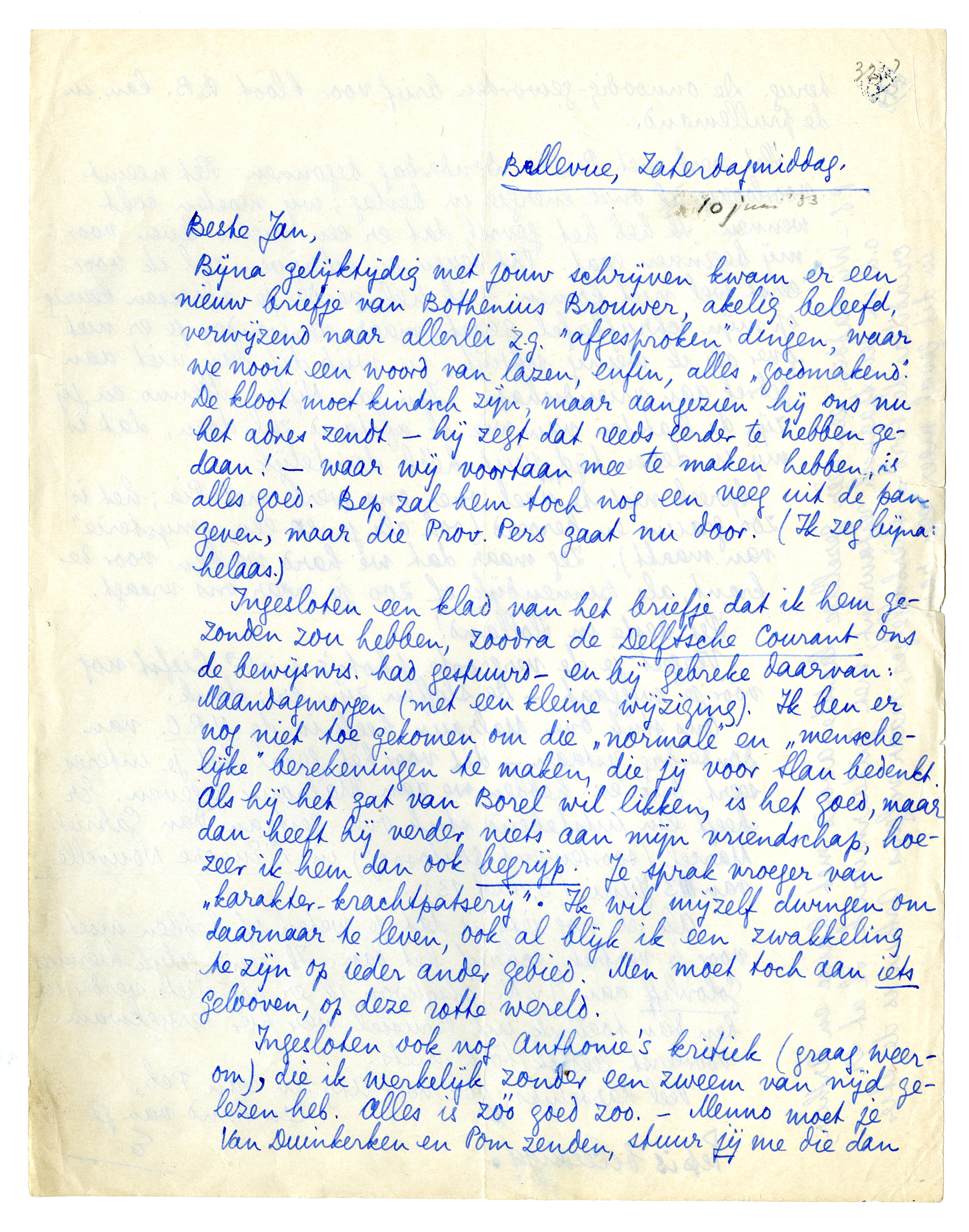 Ingesloten ook nog Anthonie's kritiek (graag weerom), die ik werkelijk zonder een zweem van nijd gelezen heb. Alles is zóó goed zoo. - Menno moet je Van Duinkerken en Pom zenden, stuur jij me die dan terug. De onnoodig-geworden brief voor kloot B.B. kan in de prullemand.