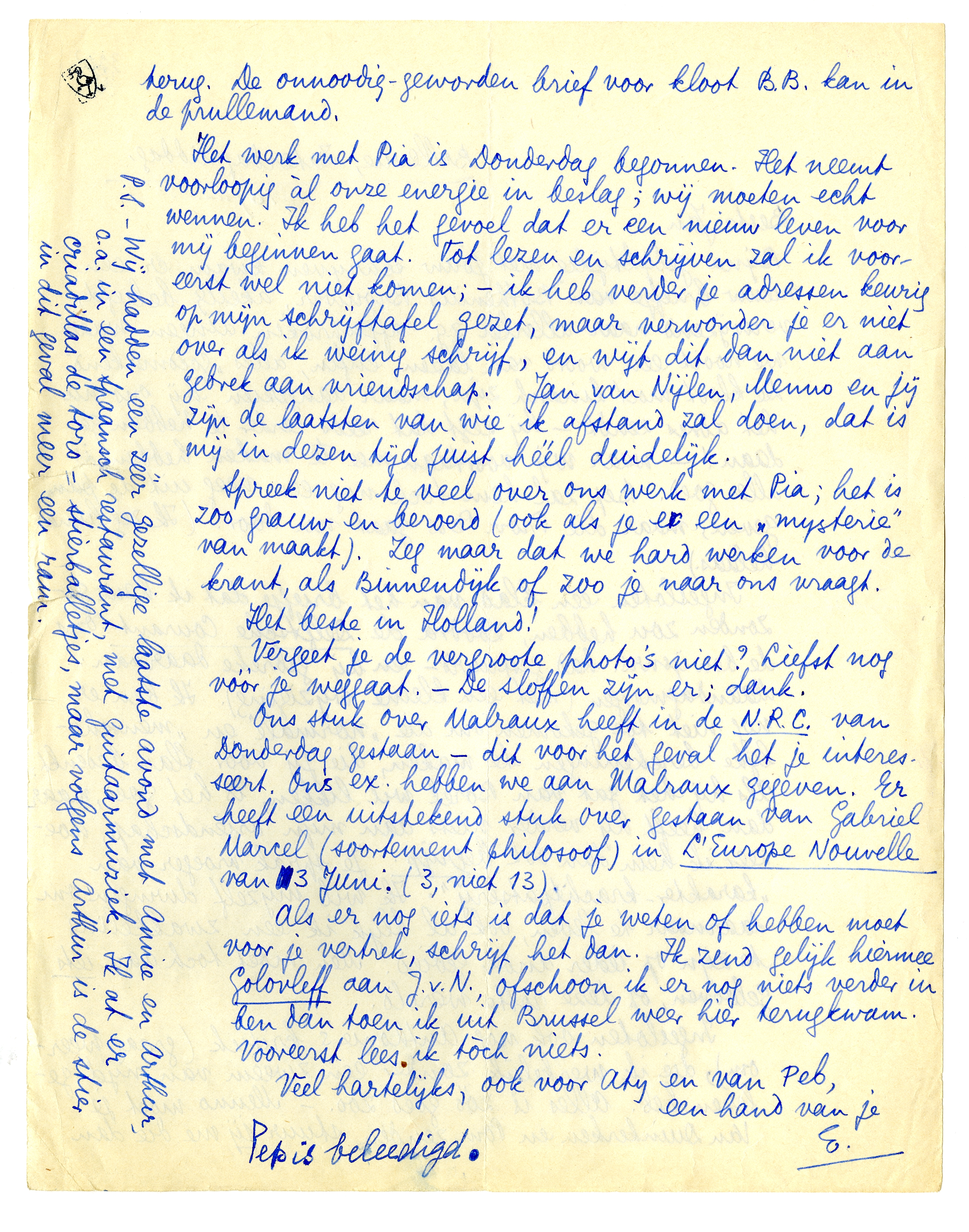 Het werk met Pia is Donderdag begonnen. Het neemt voorloo-pig àl onze energie in beslag; wij moeten echt wennen. Ik heb het gevoel dat er een nieuw leven voor mij beginnen gaat. Tot lezen en schrijven zal ik vooreerst wel niet komen; - ik heb verder je adressen keurig op mijn schrijftafel gezet, maar verwonder je er niet over als ik weinig schrijf en wijt dit dan niet aan gebrek aan vriendschap. Jan van Nijlen, Menno en jij zijn de laatsten van wie ik afstand zal doen, dat is mij in dezen tijd juist héél duidelijk.