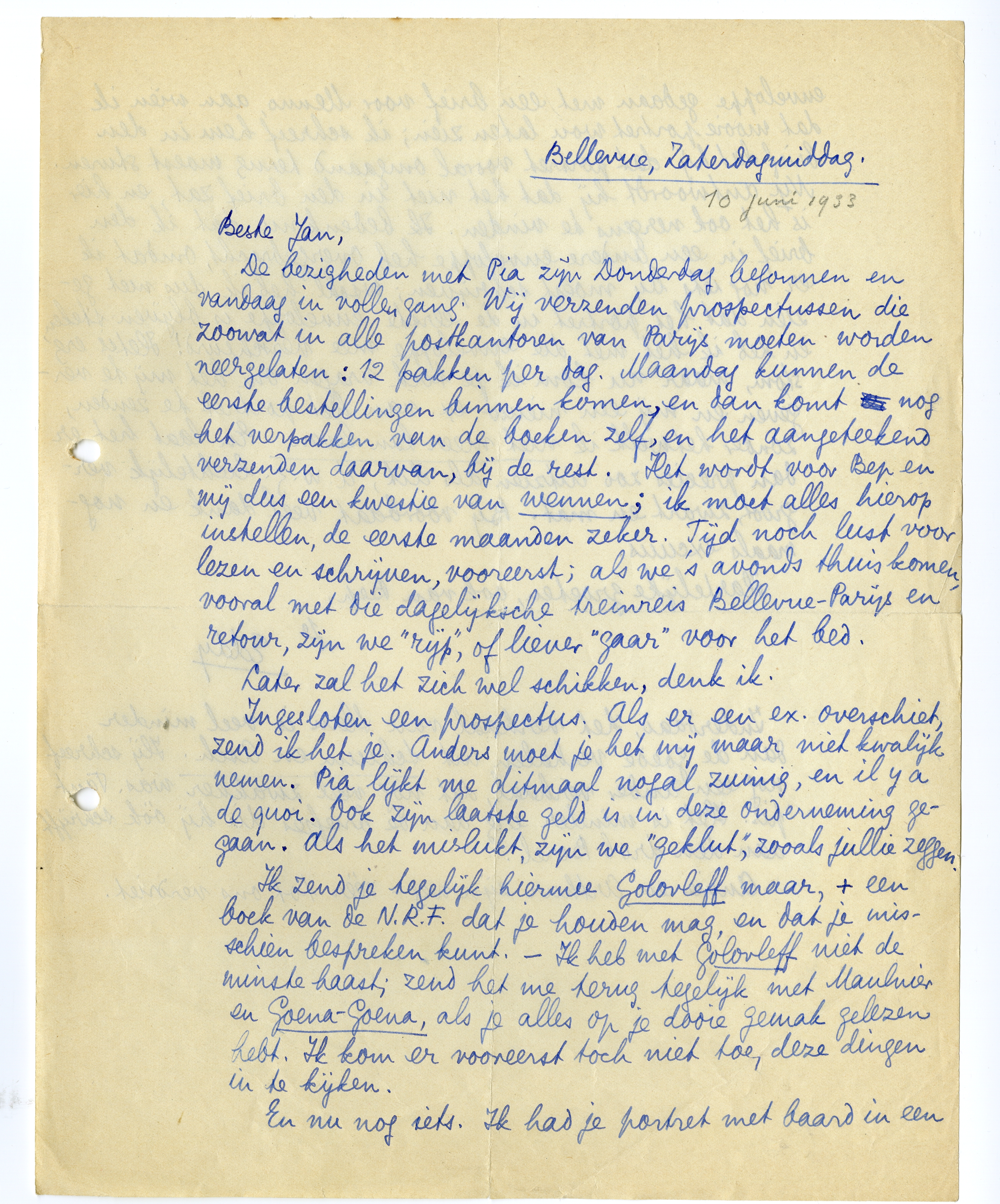 De bezigheden met Pia zijn Donderdag begonnen en vandaag in vollen gang. Wij verzenden prospectussen die zoowat in alle postkantoren van Parijs moeten worden neergelaten: 12 pakken per dag. Maandag kunnen de eerste bestellingen binnen komen, en dan komt nog het verpakken van de boeken zelf, en het aangeteekend verzenden daarvan, bij de rest. Het wordt voor Bep en mij dus een kwestie van wennen; ik moet alles hierop instellen, de eerste maanden zeker. Tijd noch lust voor lezen en schrijven, vooreerst; als we 's avonds thuis komen, vooral met die dagelijksche treinreis Bellevue-Parijs en retour, zijn we ‘rijp’, of liever ‘gaar’ voor het bed.