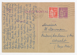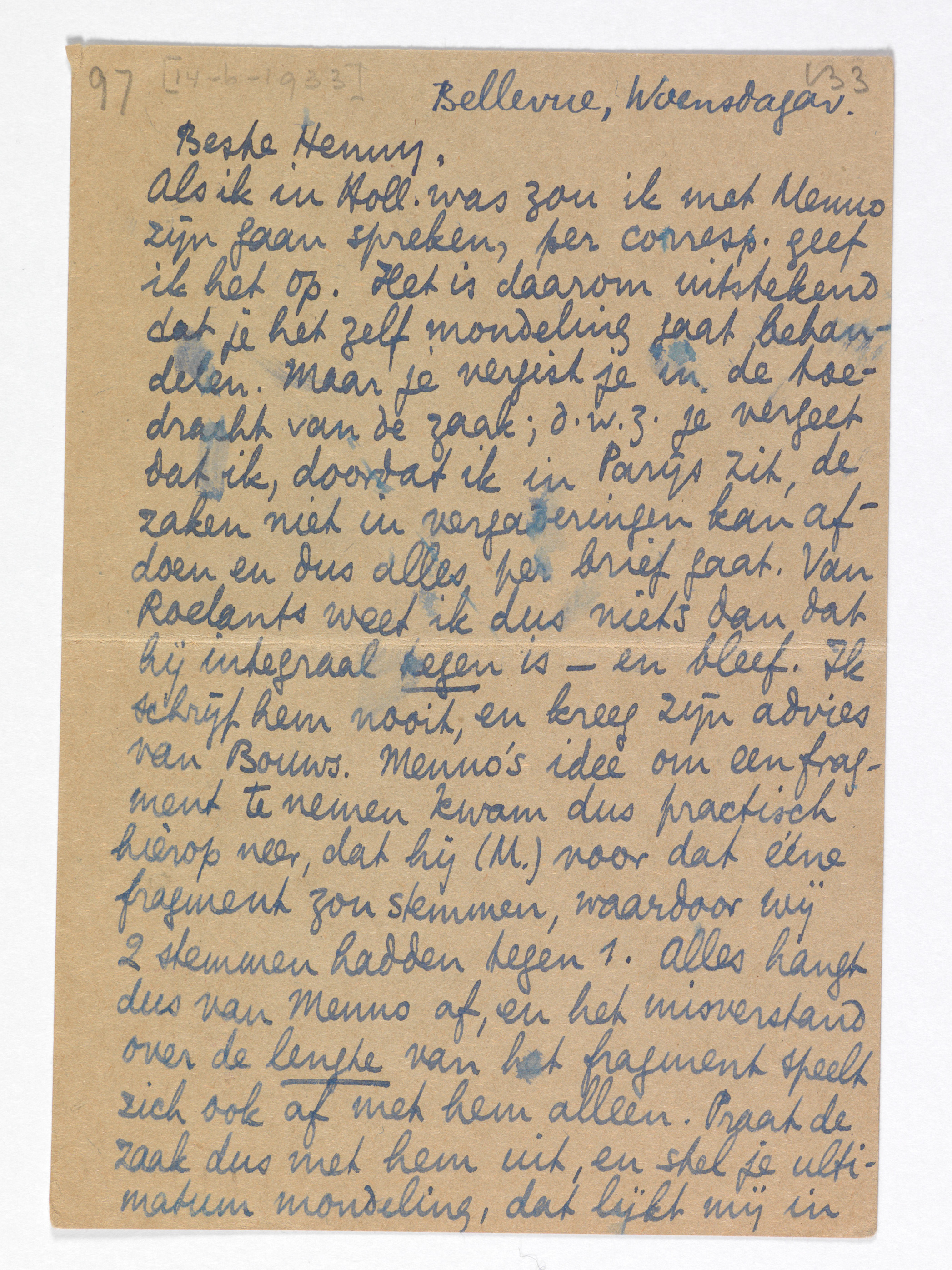 Als ik in Holl. was zou ik met Menno zijn gaan spreken, per corresp. geef ik het op. Het is daarom uitstekend dat je het zelf mondeling gaat behandelen. Maar je vergist je in de toedracht van de zaak; d.w.z. je vergeet dat ik, doordat ik in Parijs zit, de zaken niet in vergaderingen kan afdoen en dus alles per brief gaat. Van Roelants weet ik dus niets dan dat hij integraal tegen is - en bleef. Ik schrijf hem nooit, en kreeg zijn advies van Bouws. Menno's idee om een fragment te nemen kwam dus practisch hierop neer, dat hij (M.) voor dat ééne fragment zou stemmen, waardoor wij 2 stemmen hadden tegen 1. Alles hangt dus van Menno af, en het misverstand over de lengte van het fragment speelt zich ook af met hem alleen. Praat de zaak dus met hem uit, en stel je ultimatum mondeling, dat lijkt mij in ieder opzicht beter. - Nu over je komst. Ik kan onmogelijk iets vooruit afspreken, omdat ik niet weet waar wij zelf aan toe zijn. Gaan de zaken met Pia mis (wat best kan!) dan zijn we in den aap gelogeerd en moeten ons blauw schrijven of God weet wat doen, of vóór October al van hier opbreken en misschien naar Holland gaan. Het spant èrg, op het oogenblik. Ik zal je schrijven, als er wat uitzicht komt. Hart. gr. van