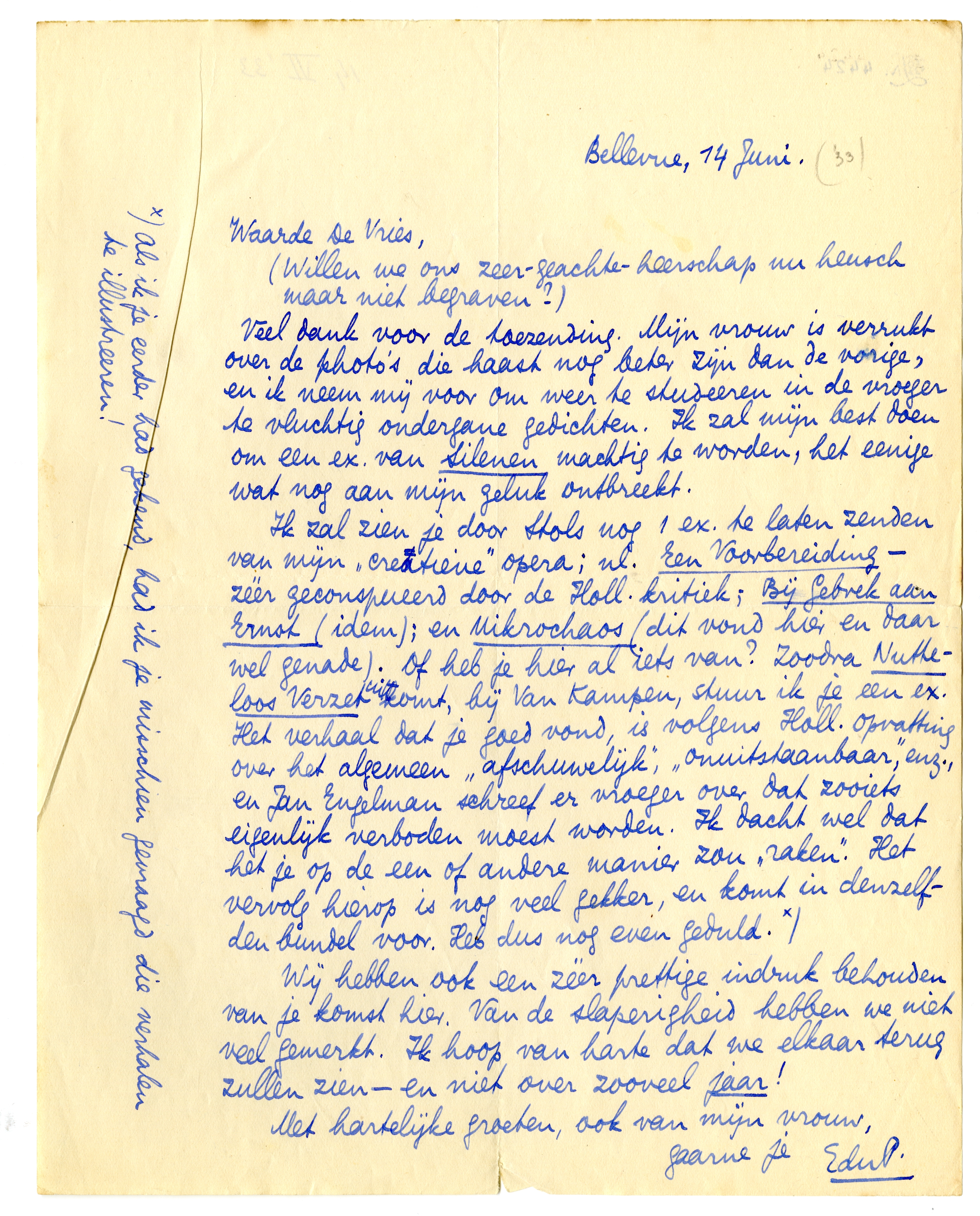 Ik zal zien je door Stols nog 1 ex. te laten zenden van mijn ‘creatieve’ opera; nl. Een Voorbereiding - zéér geconspueerd door de Holl. kritiek; Bij Gebrek aan Ernst (idem); en Mikrochaos (dit vond hier en daar wel genade). Of heb je hier al iets van? Zoodra Nutteloos Verzet uitkomt, bij Van Kampen, stuur ik je een ex. Het verhaal dat je goed vond, is volgens Holl. opvatting over het algemeen ‘afschuwelijk’, ‘onuitstaanbaar’, enz., en Jan Engelman schreef er vroeger over dat zooiets eigenlijk verboden moest worden. Ik dacht wel dat het je op de een of andere manier zou ‘raken'. Het vervolg hierop is nog veel gekker, en komt in denzelfden bundel voor. Heb dus nog even geduld.*