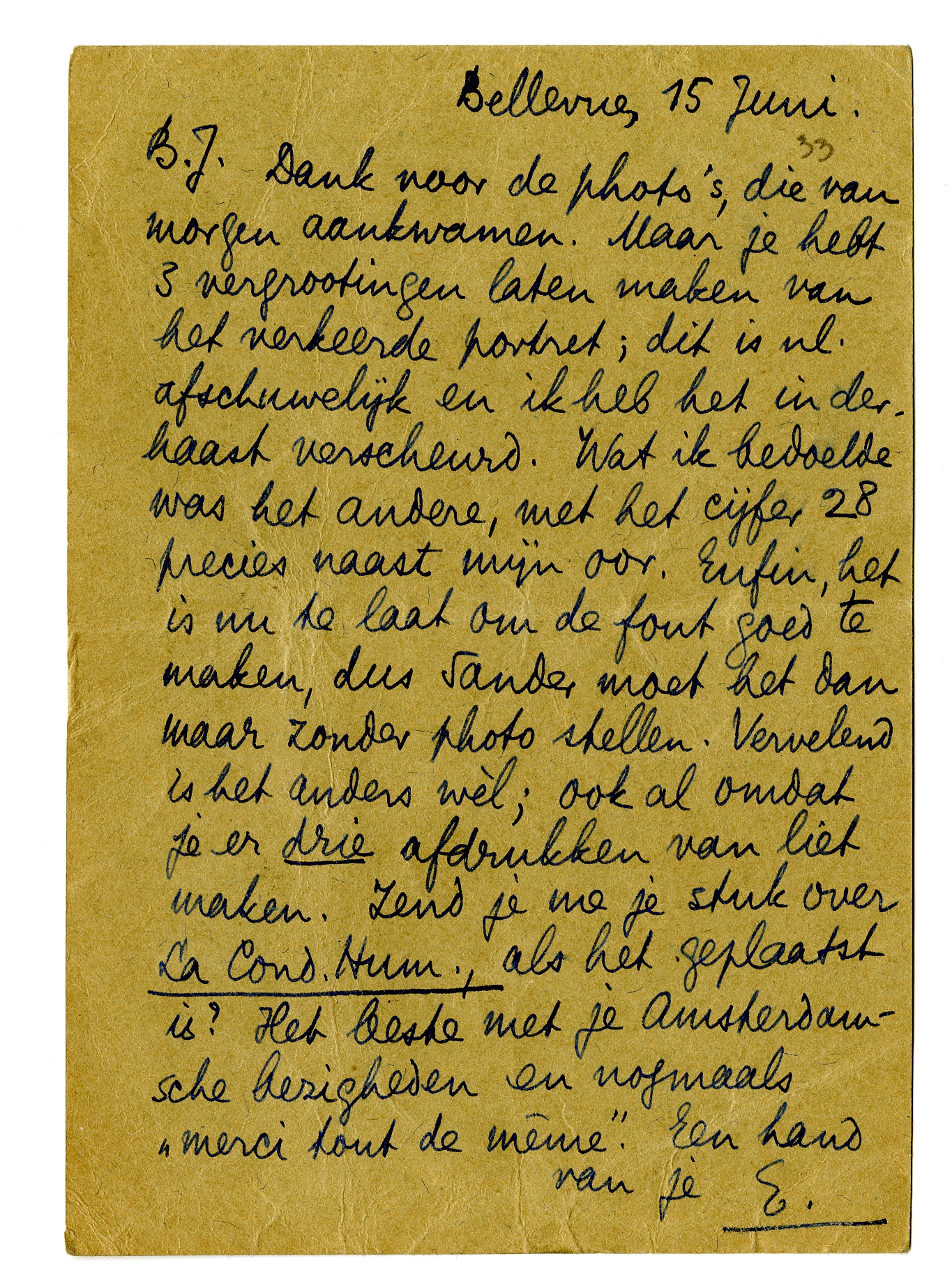 B.J. Dank voor de photo's, die vanmorgen aankwamen. Maar je hebt 3 vergrootingen laten maken van het verkeerde portret; dit is nl. afschuwelijk en ik heb het inderhaast verscheurd. Wat ik bedoelde was het andere, met het cijfer 28 precies naast mijn oor. Enfin, het is nu te laat om de fout goed te maken, dus Sander moet het dan maar zonder photo stellen. Vervelend is het anders wèl; ook al omdat je er drie afdrukken van liet maken. Zend je me je stuk over La Cond. Hum.,2773 als het geplaatst is? Het beste met je Amsterdamsche bezigheden en nogmaals ‘merci tout de même’. Een hand