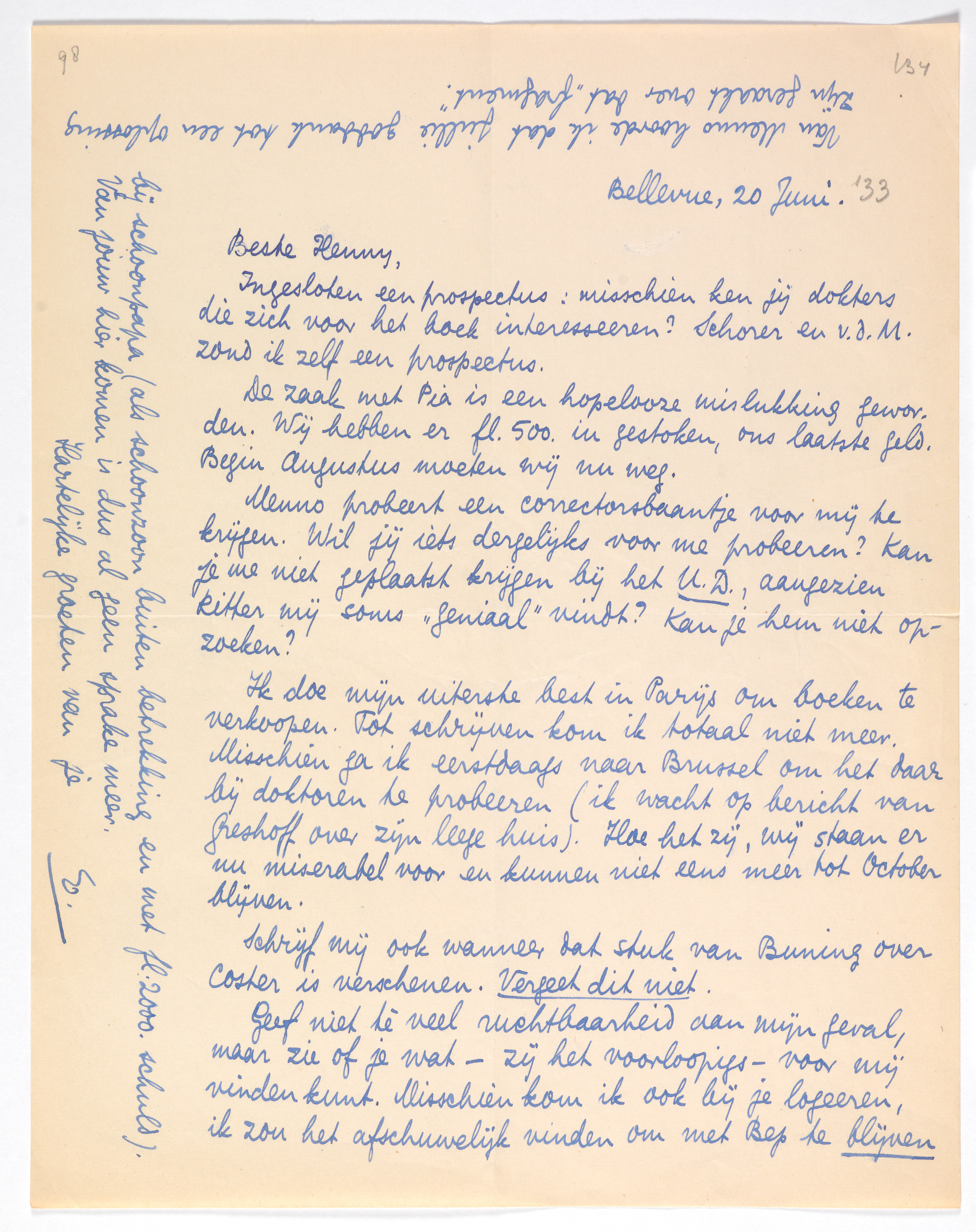 Ik doe mijn uiterste best in Parijs om boeken te verkoopen. Tot schrijven kom ik totaal niet meer. Misschien ga ik eerstdaags naar Brussel om het daar bij doktoren te probeeren (ik wacht op bericht van Greshoff over zijn leege huis). Hoe het zij, wij staan er nu misschien miserabel voor en kunnen niet eens meer tot October blijven.