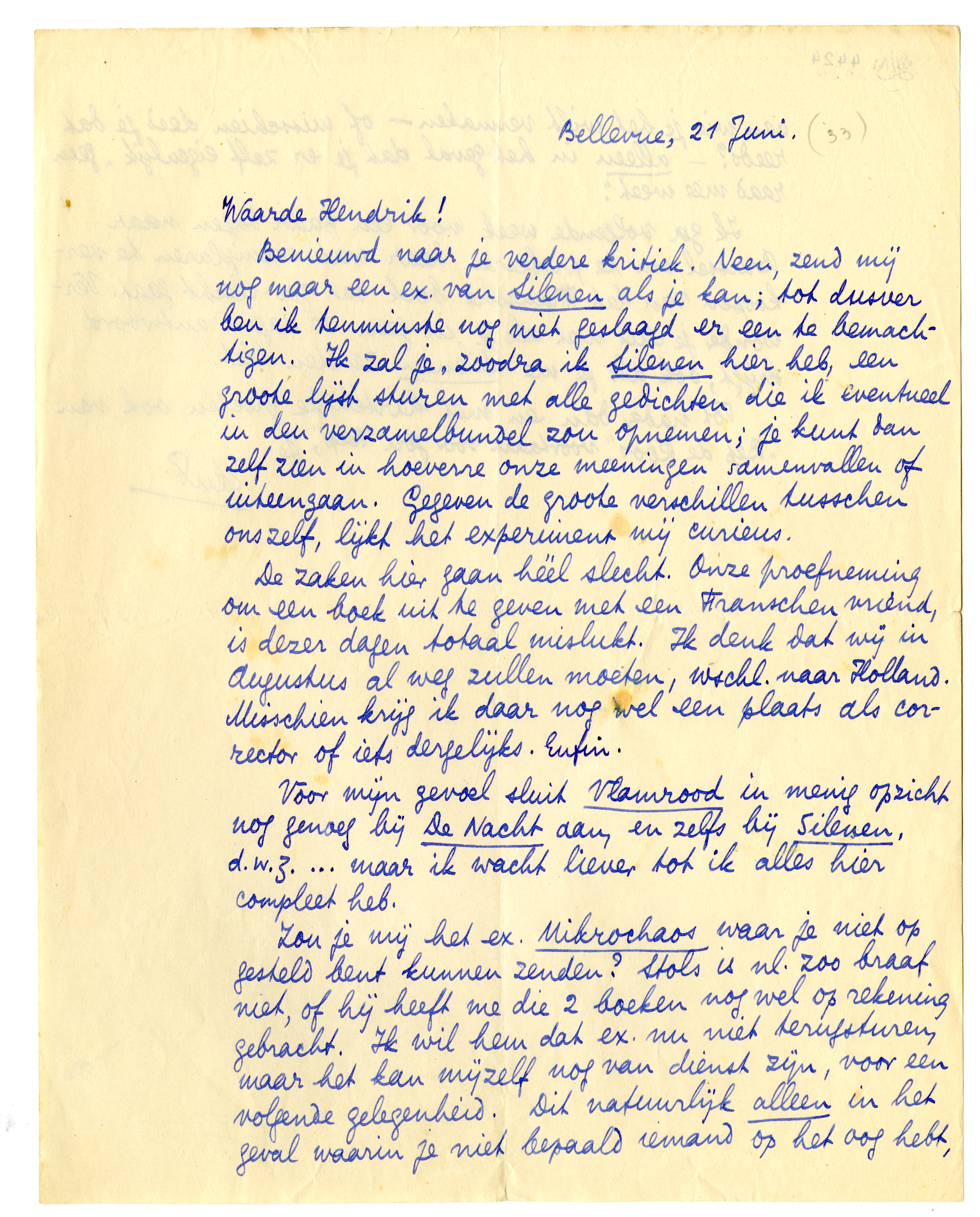 Benieuwd naar je verdere kritiek. Neen, zend mij nog maar een ex. van Silenen als je kan; tot dusver ben ik tenminste nog niet geslaagd er een te bemachtigen. Ik zal je, zoodra ik Silenen hier heb, een groote lijst sturen met alle gedichten die ik eventueel in den verzamelbundel2780 zou opnemen; je kunt dan zelf zien in hoeverre onze meeningen samenvallen of uiteengaan. Gegeven de groote verschillen tusschen onszelf, lijkt het experiment mij curieus.
