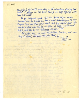 De zaken hier gaan héél slecht. Onze proefneming om een boek uit te geven met een Franschen vriend, is dezer dagen totaal mislukt. Ik denk dat wij in Augustus al weg zullen moeten, wschl. naar Holland. Misschien krijg ik daar nog wel een plaats als corrector of iets dergelijks. Enfin.