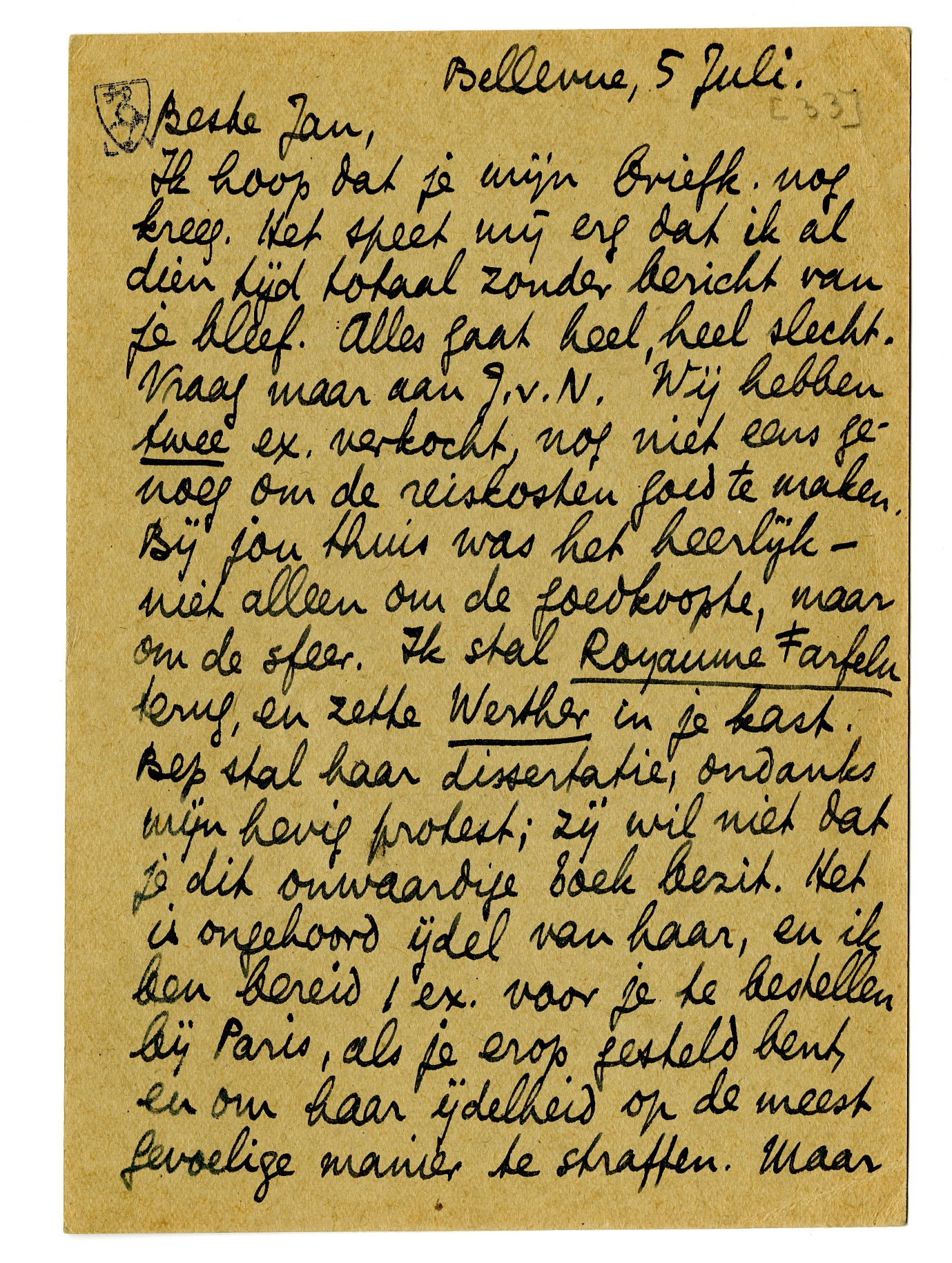 Ik hoop dat je mijn briefk. nog kreeg. Het speet mij erg dat ik al dien tijd totaal zonder bericht van je bleef. Alles gaat heel, heel slecht. Vraag maar aan J.v.N. Wij hebben twee ex. verkocht, nog niet eens genoeg om de reiskosten goed te maken. Bij jou thuis was het heerlijk - niet alleen om de goedkoopte, maar om de sfeer. Ik stal Royaume Farfelu terug, en zette Werther in je kast. Bep stal haar dissertatie,2784 ondanks mijn hevig protest; zij wil niet dat je dit onwaardige boek bezit. Het is ongehoord ijdel van haar, en ik ben bereid 1 ex. voor je te bestellen bij Paris, als je erop gesteld bent, en om haar ijdelheid op de meest gevoelige manier te straffen. Maar laat eerst wat van je hooren! En als je weer naar Holland gaat, kan je niet informeeren naar werk voor me? We weten niet meer wat we doen moeten; vanaf Aug. kan ik alleen nog maar 500 frs. sturen voor Gille (die moet ik dan nog verdienen). Het geleende geld is dan op, en verder leenen doe ik niet. Later meer. Nu veel hartelijks van ons tweeën en dank voor de gastvrijheid. Je