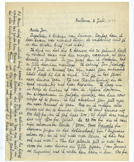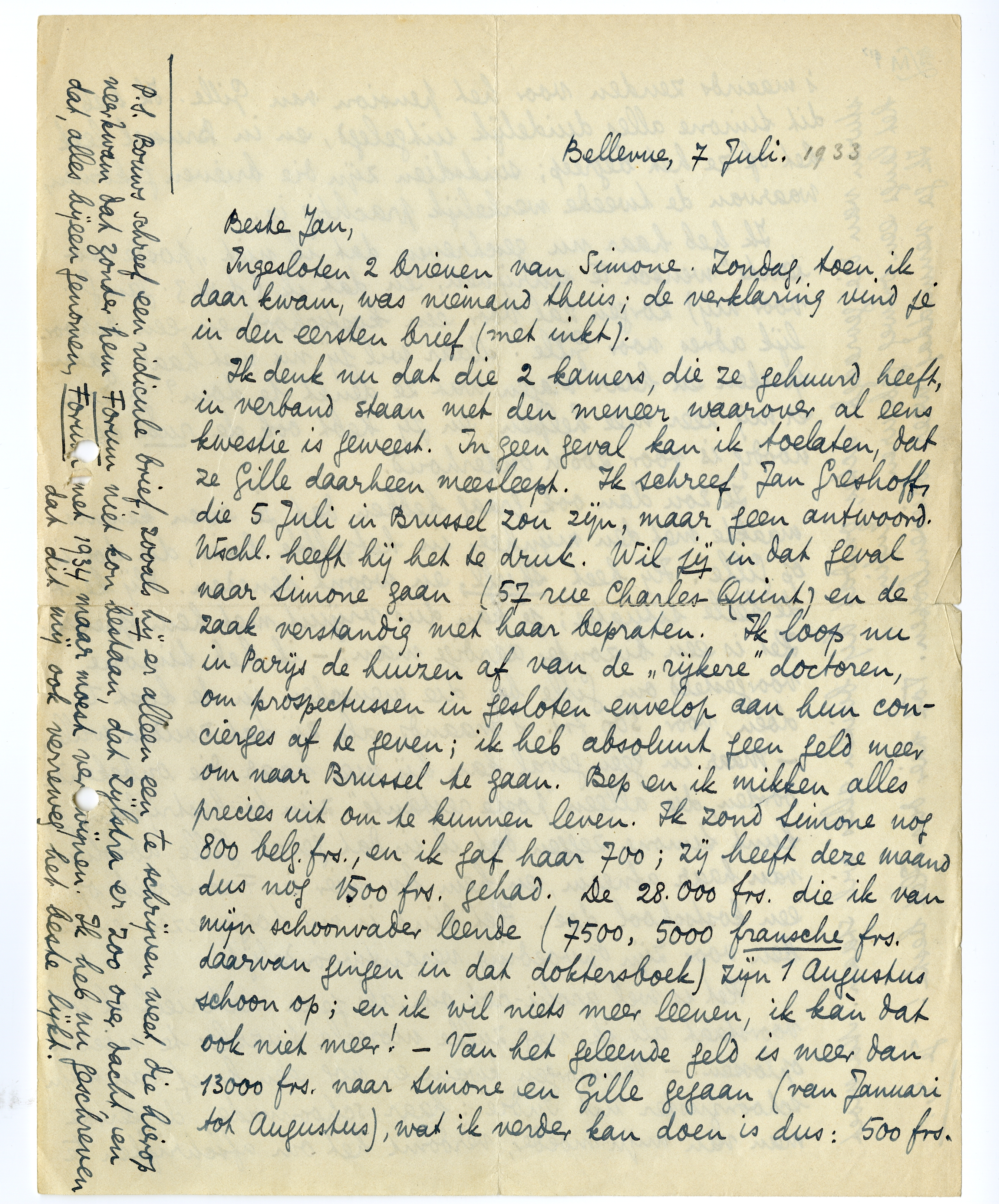 Ik denk nu dat die 2 kamers, die ze gehuurd heeft, in verband staan met den meneer waarover al eens kwestie is geweest. In geen geval kan ik toelaten, dat ze Gille daarheen meesleept. Ik schreef Jan Greshoff, die 5 Juli in Brussel zou zijn, maar geen antwoord. Wschl. heeft hij het te druk. Wil jij in dat geval naar Simone gaan (57 rue Charles-Quint) en de zaak verstandig met haar bepraten. Ik loop nu in Parijs de huizen af van de ‘rijkere’ doctoren, om prospectussen in gesloten envelop aan hun concierges af te geven; ik heb absoluut geen geld meer om naar Brussel te gaan. Bep en ik mikken alles precies uit om te kunnen leven. Ik zond Simone nog 800 belg. frs., en ik gaf haar 700; zij heeft deze maand dus nog 1500 frs. gehad. De 28.000 frs. die ik van mijn schoonvader leende (7500, 5000 fransche frs. daarvan gingen in dat doktersboek) zijn 1 Augustus schoon op; en ik wil niets meer leenen, ik kàn dat ook niet meer! - Van het geleende geld is meer dan 13000 frs. naar Simone en Gille gegaan (van Januari tot Augustus), wat ik verder kan doen is dus: 500 frs. 's maands zenden voor het pension van Gille. Ik heb dit Simone alles duidelijk uitgelegd, en in Brussel leek het of ze het begreep; sindsdien zijn die brieven gekomen, waarvan de tweede werkelijk prachtig is.