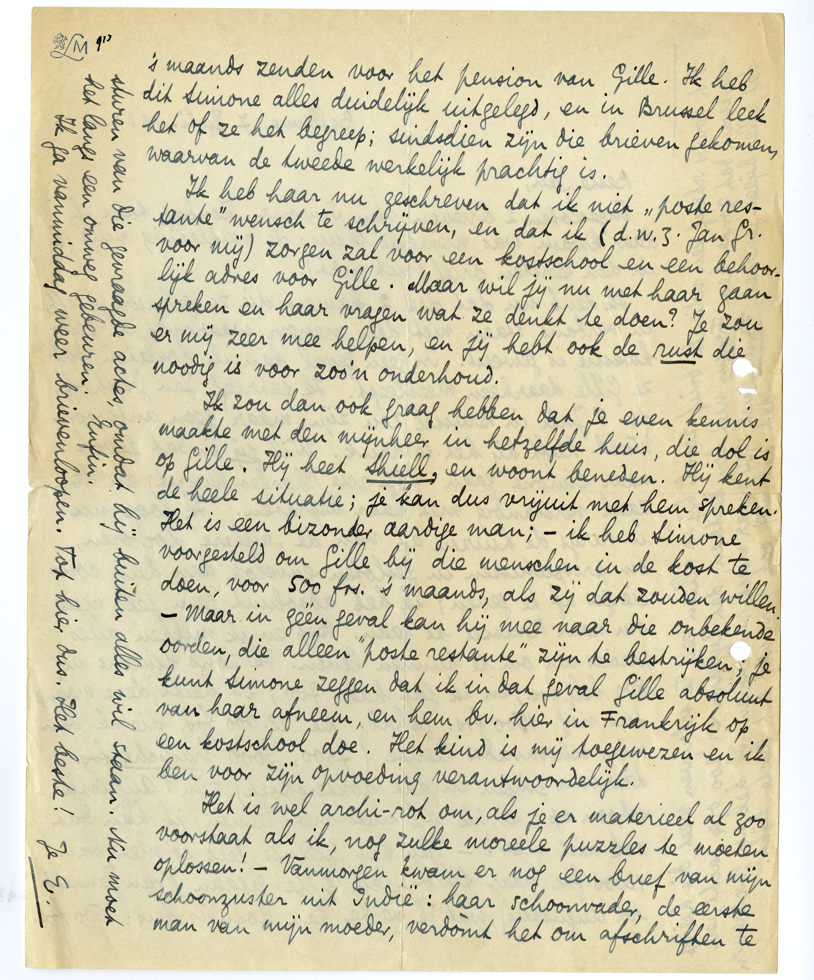 Ik zou dan ook graag hebben dat je even kennis maakte met den mijnheer in hetzelfde huis, die dol is op Gille. Hij heet Shiell, en woont beneden. Hij kent de heele situatie; je kan dus vrijuit met hem spreken. Het is een bizonder aardige man; - ik heb Simone voorgesteld om Gille bij die menschen in de kost te doen, voor 500 frs. 's maands, als zij dat zouden willen. - Maar in géén geval kan hij mee naar die onbekende oorden, die alleen ‘poste restante’ zijn te bestrijken; je kunt Simone zeggen dat ik in dat geval Gille absoluut van haar afneem, en hem bv. hier in Frankrijk op een kostschool doe. Het kind is mij toegewezen en ik ben voor zijn opvoeding verantwoordelijk.