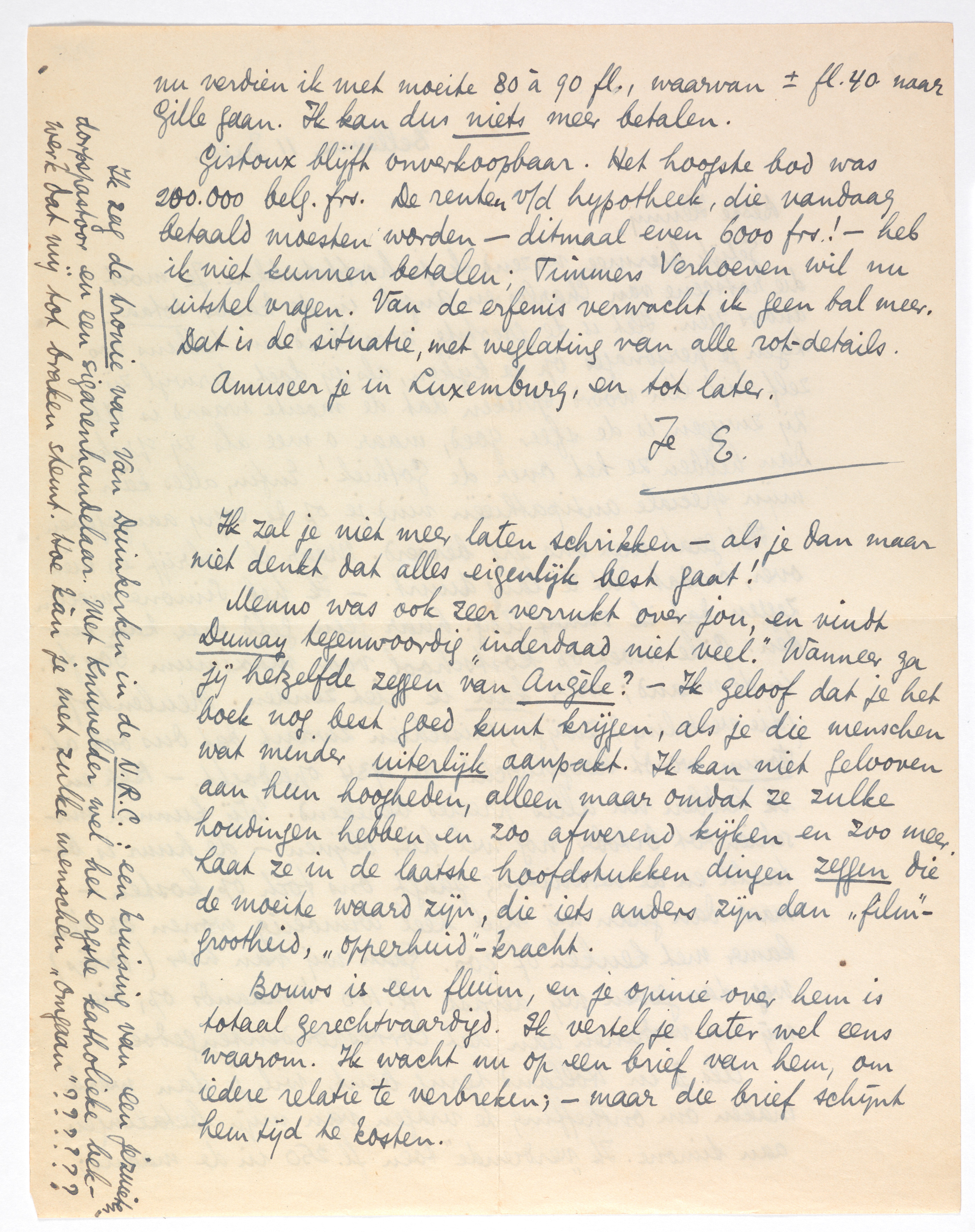 Gistoux blijft onverkoopbaar. Het hoogste bod was 200.000 belg. frs. De renten v/d hypotheek, die vandaag betaald moesten worden - ditmaal even 6000 frs.! - heb ik niet kunnen betalen; Timmers Verhoeven wil nu uitstel vragen. Van de erfenis verwacht ik geen bal meer. Dat is de situatie, met weglating van alle rot-details.